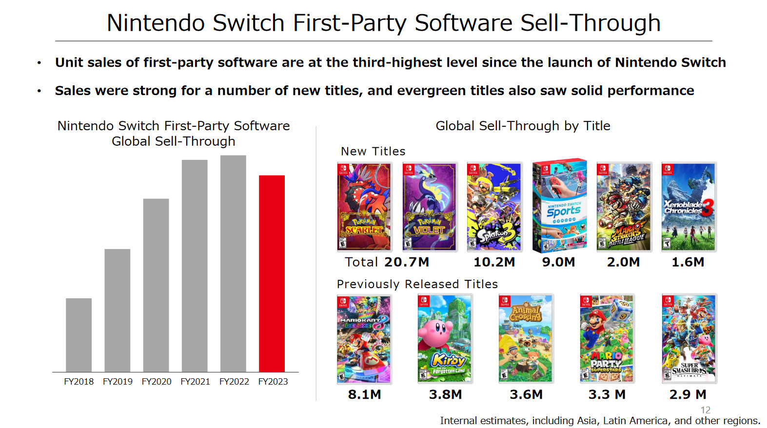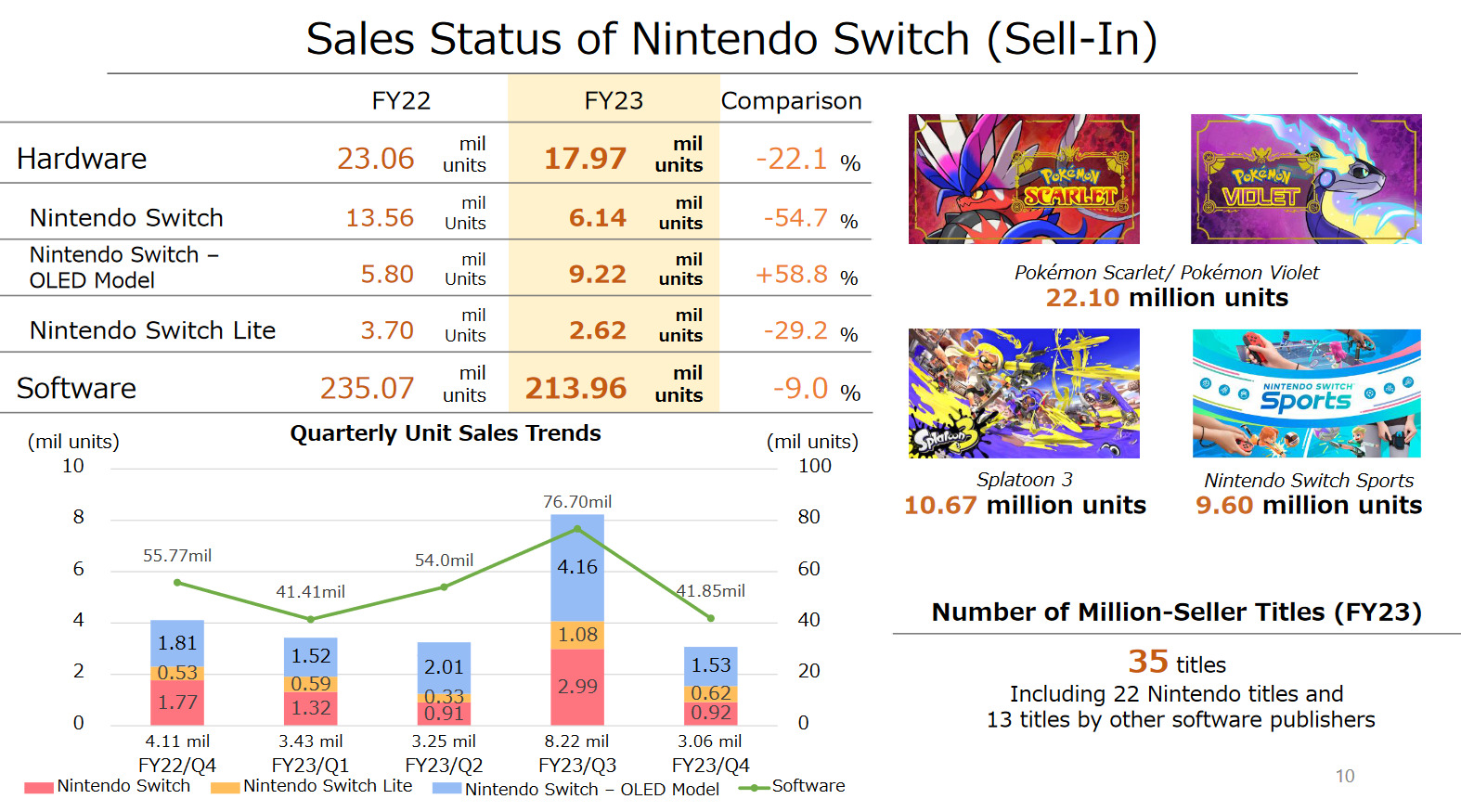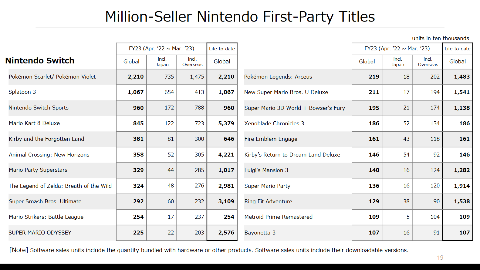 Côté jeux, 213,96 millions de jeux écoulés sur Nintendo Switch lors de la dernière année, en baisse de 9%. C’est peu, mais c’est la première baisse de son histoire. Fire Emblem Engage s’est vendu à plus de 1,61 million d’exemplaires au cours du premier trimestre. Il s’agit d’un démarrage plus lent que celui de Fire Emblem : Three Houses, qui s’est écoulé à environ 2,29 millions d’exemplaires au cours de la même période. Mais cela fait d’Engage le quatrième best-seller de la série à ce jour.