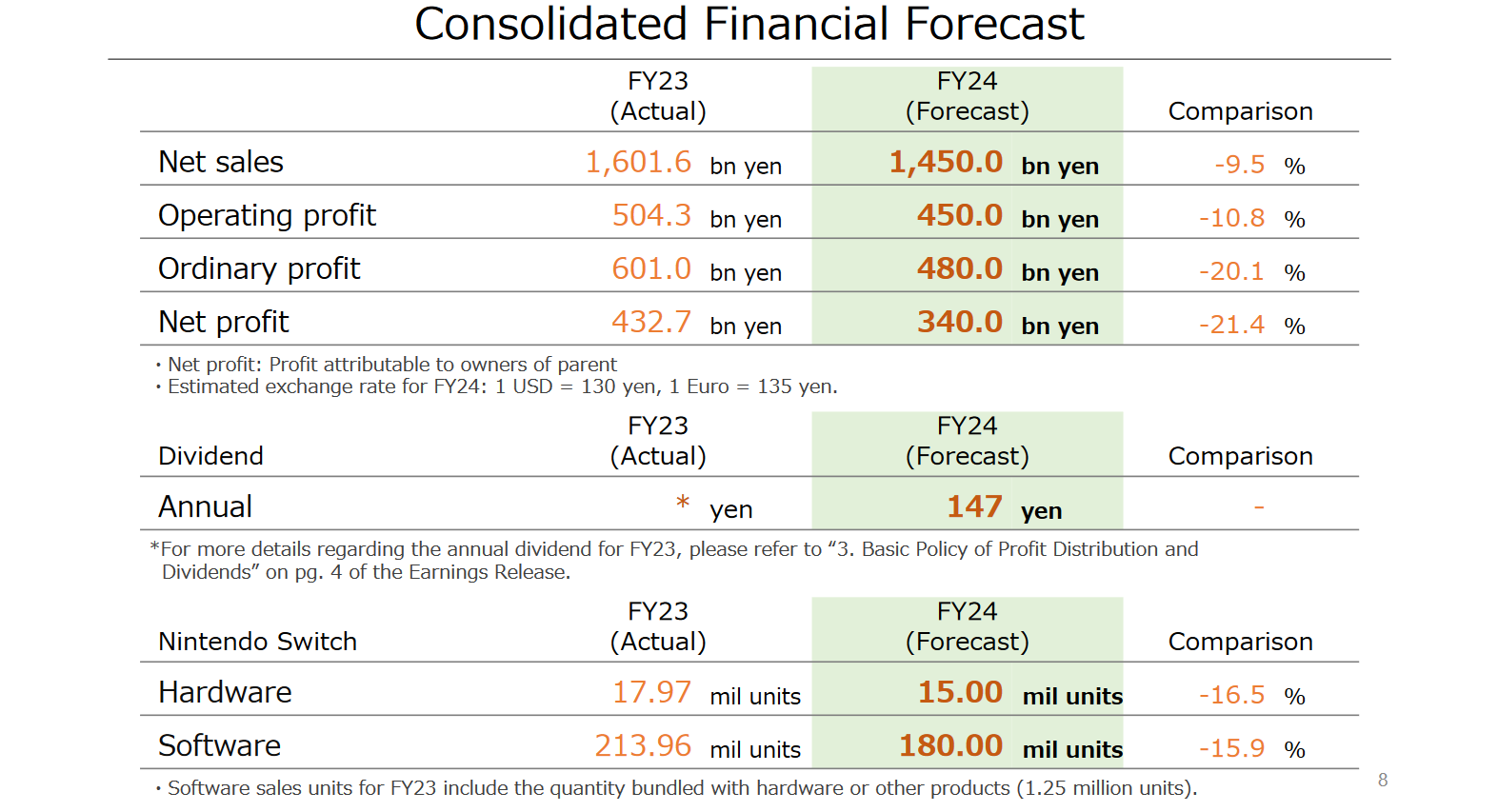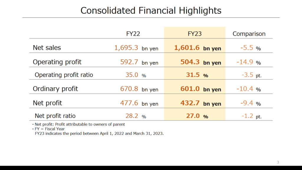 Le bénéfice net de Nintendo a baissé à 432,7 milliards de yens, tout en restant la troisième meilleure année pour l’entreprise. En ce qui concerne le chiffre d’affaires net, Nintendo a dépassé ses prévisions de 1,67 milliard de yens. Par rapport à l’année précédente, il s’agit d’une légère baisse globale. Plus précisément, les ventes de logiciels et de matériel suivent la baisse du nombre d’unités. Les dépenses en recherche et développement de Nintendo atteignent 31,6 milliards de yens. Il s’agit d’un nouveau record pour un exercice fiscal de 110 milliards de yens.
