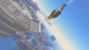 À la recherche de Zelda sur notre grand archipel d’îles célestes, nous tombons sur le Temple du Temps. Rauru nous indique que pour y accéder, Link aura besoin de restituer un peu de pouvoir à son bras. L’aventure commence dans le ciel où nous explorons un environnement inédit, plutôt vaste et ouvert afin de restaurer les pouvoirs de notre nouveau bras. Une première zone qui fait office de premier tutoriel aux bases du jeu avec quelques sanctuaires à trouver et explorer afin de pouvoir accéder au Temple du Temps. Un début similaire à Breath of the Wild et son Plateau du Prélude, d’ailleurs, nous démarrons Tears of the Kingdom sur les îles Célestes du Prélude. Sauf bug à exploiter que nous n’avons pas trouvé, notre exploration, bien que très vaste, est limitée à ces îles célestes. Une fois le Temple du Temps atteint, Link entend l’appel de la princesse Zelda qui lui somme de la retrouver sur Terre. Link saute et revient sur Hyrule afin d’accomplir sa destinée.