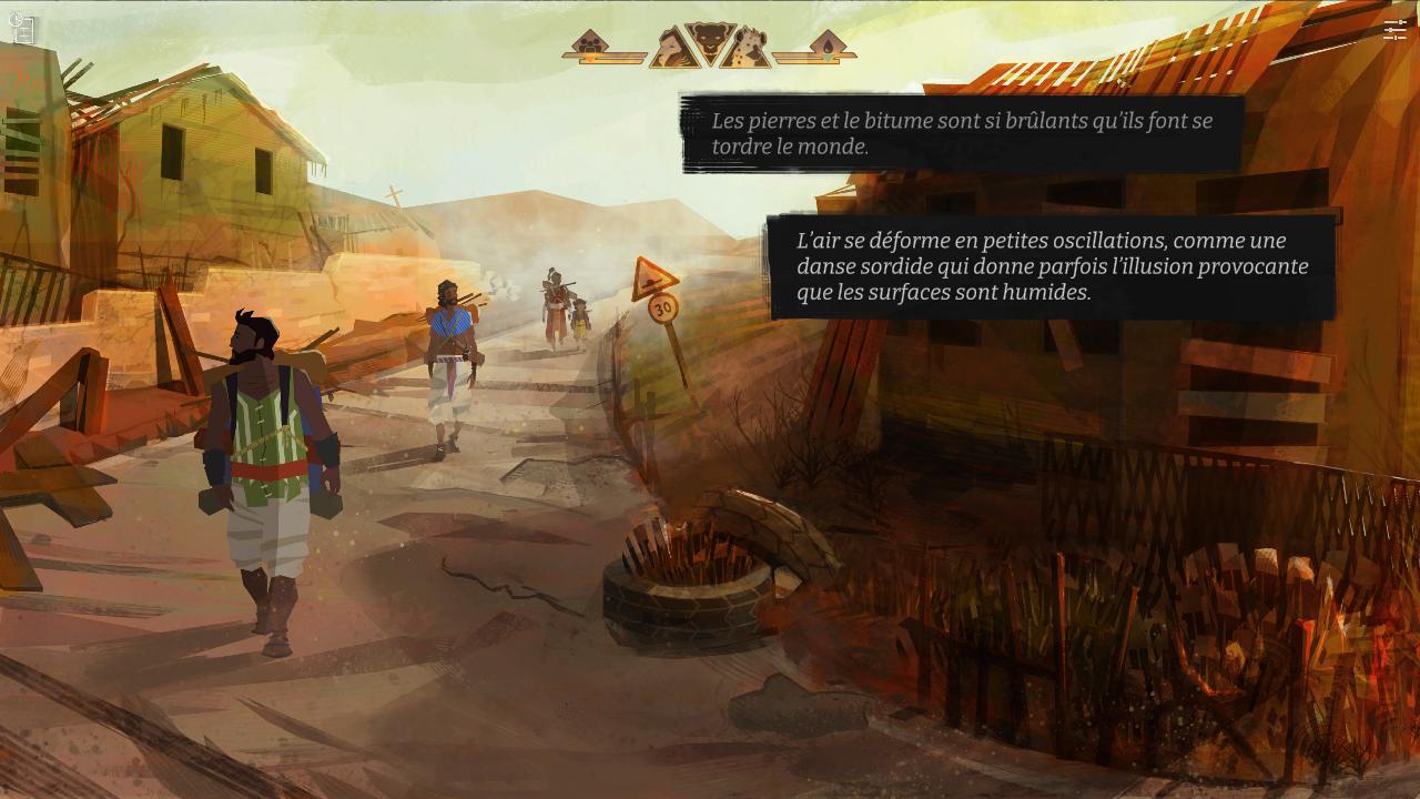 Nous incarnons un petit groupe de survivants qui quittent leur village. Nous partons pour trouver une terre hospitalière, loin de l’aridité dans laquelle nous vivons. Cette « famille » est constituée de quatre personnes. Il y a Camille, le « chef » du groupe, un homme qui ne manque pas de courage, mais qui est bien plus dans la réflexion que l’action. Il y a Nora, sa femme, une personne au caractère trempé. Intrépide, elle n’hésite pas à braver les dangers pour protéger ceux qu’elle aime, et surtout son fils Sam. Il y a aussi Rafik, le socialisateur, qui ne va pas hésiter à voler ou marchander pour survivre. Nous rencontrons aussi d’autres personnages au fil de notre aventure, mais ces quatre-là constituent le noyau dur du récit que nous allons suivre.
