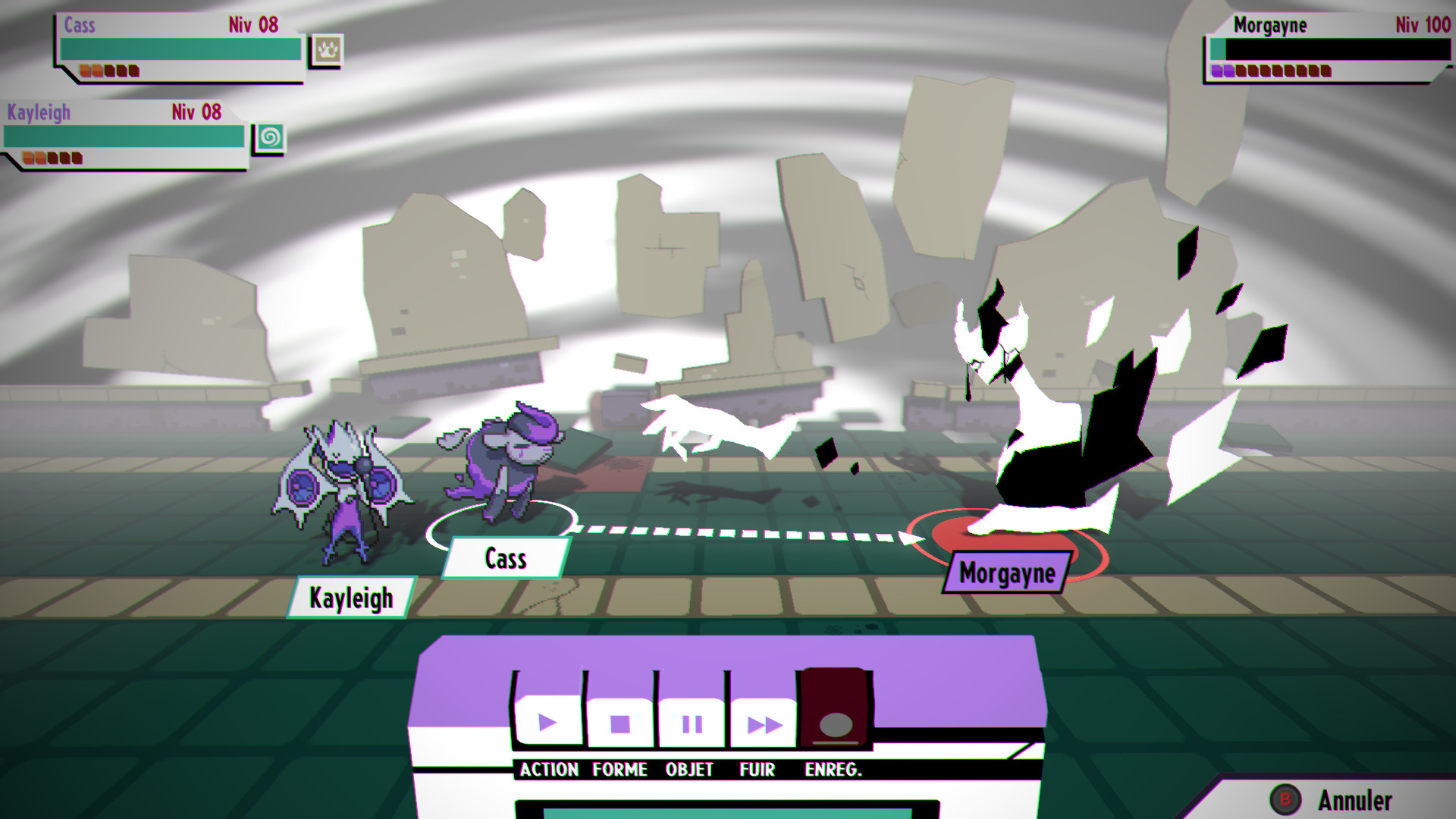 Les combats s’avèrent dès lors particulièrement stratégiques, avec un choix judicieux de monstres à maîtriser pour faire face à ceux qui se dressent contre le joueur. L’écran se présente alors comme à l’accoutumée, avec les alliés d’un côté et les ennemis de l’autre. Le joueur sélectionne l’action qu’il souhaite lancer (une compétence – alors active ou passive – contre un point d’action), l’utilisation d’un objet, le changement de forme (de monstre en cours de combat, n’oubliez pas VOUS êtes le monstre !), la fuite, ou l’enregistrement. L’enregistrement ? Parfaitement ! Rien n’est laissé au hasard dans Cassette Beasts, et nous ne pouvons que féliciter le travail porté sur la parfaite cohésion des tâches. Ainsi, la capture des monstres se fait par l’enregistrement de ces derniers sur une cassette audio (une cassette qui peut être totalement neutre, ou bien plus spécialisée dans la capture de monstres de tel ou tel type) : afin de faciliter l’enregistrement, le monstre doit être affaibli, soumis d’ores et déjà à quelques bonnes attaques des alliés. L’enregistrement demande un certain temps : le monstre est dès lors incapable de fuir ou même de mourir ! C’est le bon moment pour garder sous le coude une attaque dévastatrice et le bombarder afin de décupler les chances de captures…