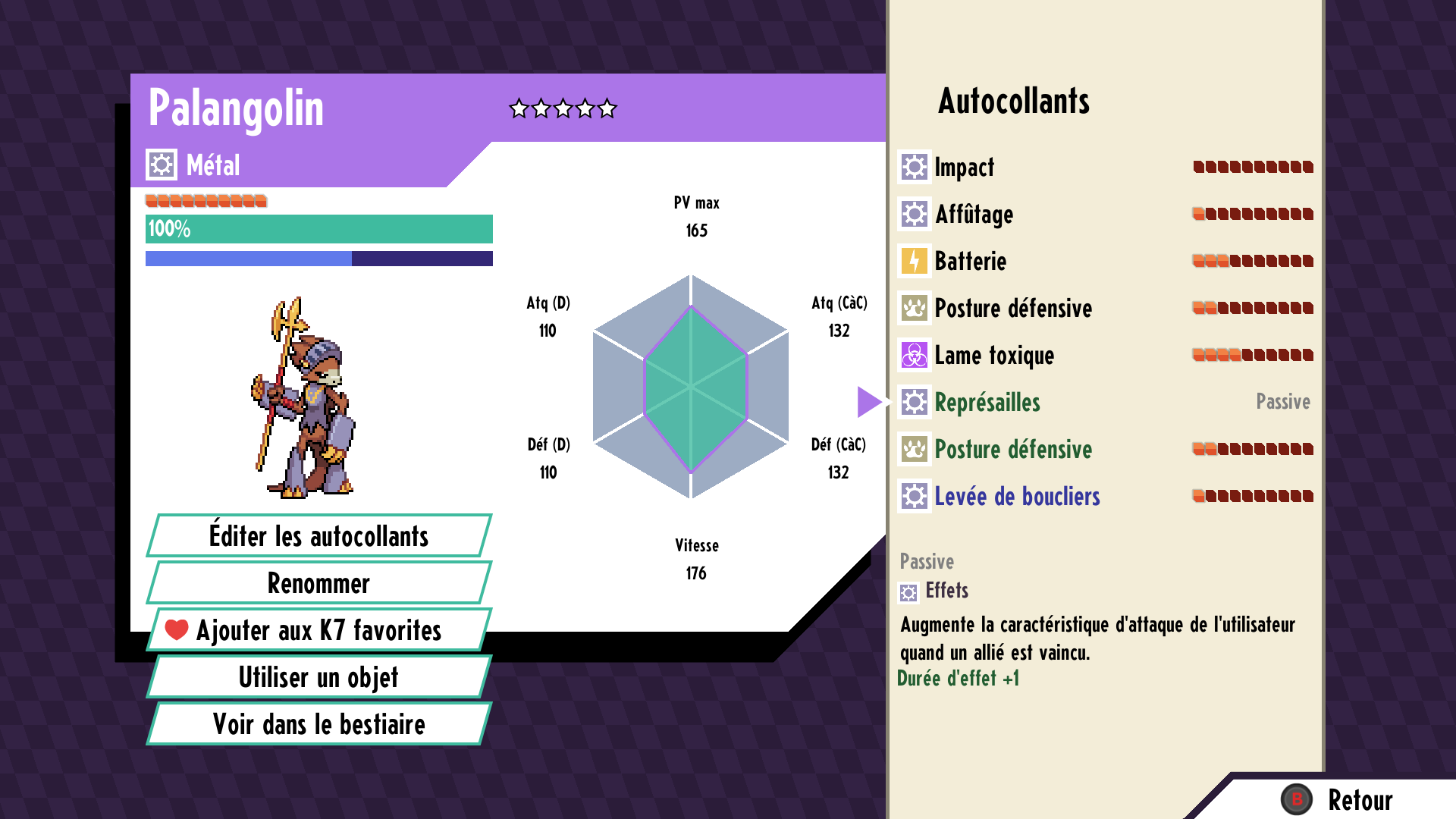 La victoire, quant à elle, donne lieu à l’acquisition de nombreux collectables, mais aussi d’expérience et de nouvelles capacités. Contrairement à ce qu’il est possible de trouver auprès d’autres titres, il n’est pas nécessaire ici de faire travailler chacun des monstres pour le faire grimper en niveau. Le joueur gagne en effet en niveau, et emporte avec lui les cassettes du même niveau. En revanche, le gain de capacité, lui, requièrent de partir au combat ou l’achat/le gain d’autocollants. Ainsi, la progression au sein de Cassette Beasts est particulièrement agréable et il n’est pas nécessaire de passer un temps fastidieux à faire progresser l’ensemble de ses monstres. Certaines de ces progressions peuvent donner lieu à des évolu… pardon, à des monstres qui se « rematricent ». Bon, bref ils évoluent quoi (il en s’agit que d’un changement de mot !). Il s’agit parfois de la seule solution pour atteindre certaines espèces… néanmoins, ces évolutions ne se font pas n’importe où (et ne sont pas obligatoires, le joueur est libre de les accepter, ou non). Il convient en effet de prendre le temps de faire une petite pause afin de pouvoir les atteindre. Ces pauses sont, par ailleurs, souvent les bienvenues… !