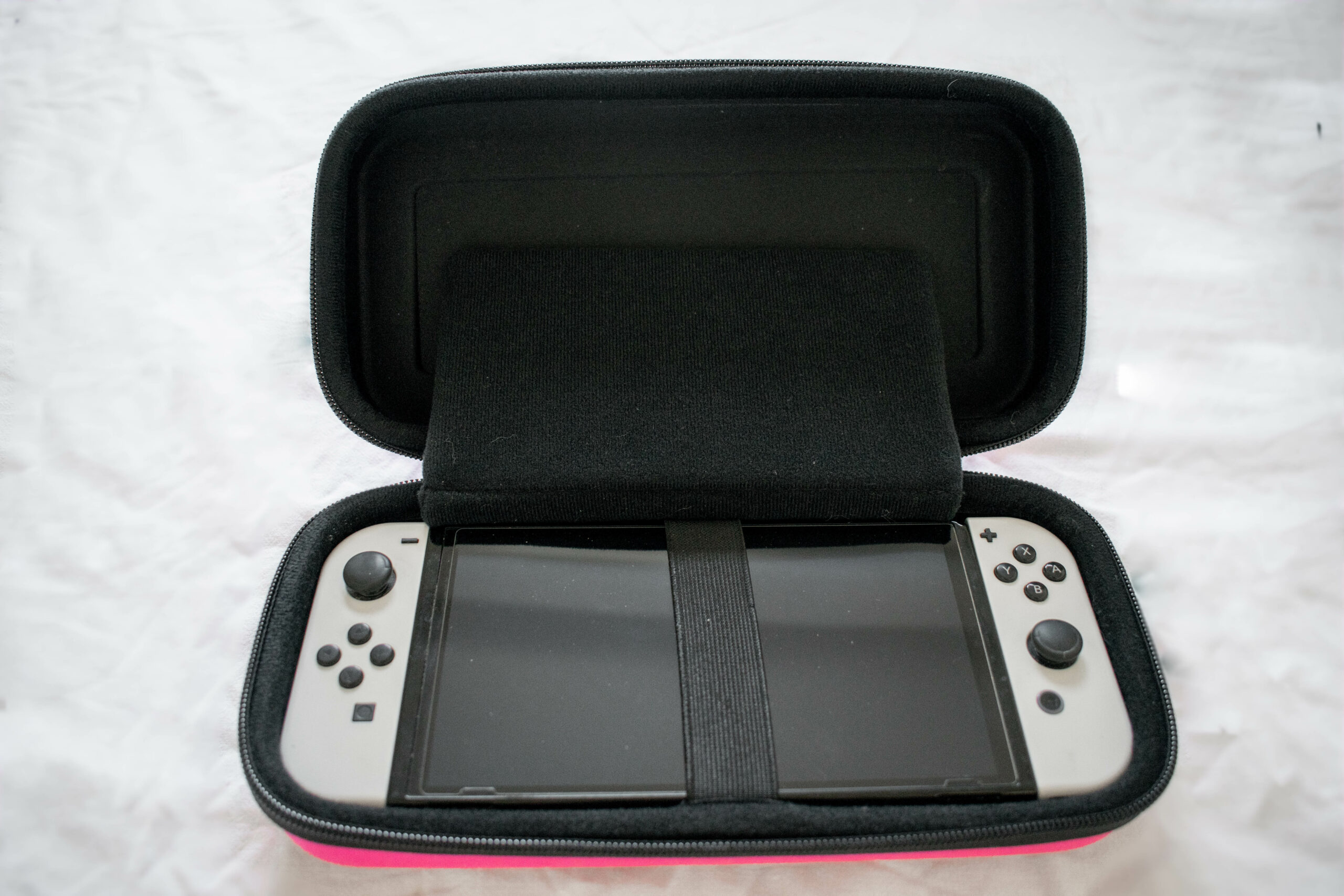 Cette pochette somme toute classique offre une résistance d’une très bonne qualité. Très solide, même après de nombreuses chutes, la pochette ne subit aucune déformation visible et le contenu reste solidement protégé. On y retrouve un emplacement pour votre console, ainsi qu’un support pour ranger son chargeur. On regrettera par contre l’absence d’emplacements pour vos cartouches de jeux.
