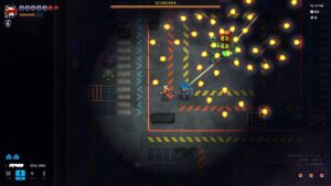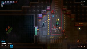 Dans la partie twin stick shooter, vous avez accès à deux armes dans votre inventaire. Chaque type d’armes a ses munitions, et vous devrez surveiller vos stocks pour ne pas vous battre à mains nues. (En réalité, on envoie des ondes de choc) Chaque type d’arme a ses propres propriétés : les armes énergétiques sont très précises alors que les explosives font des dégâts massifs de zone.