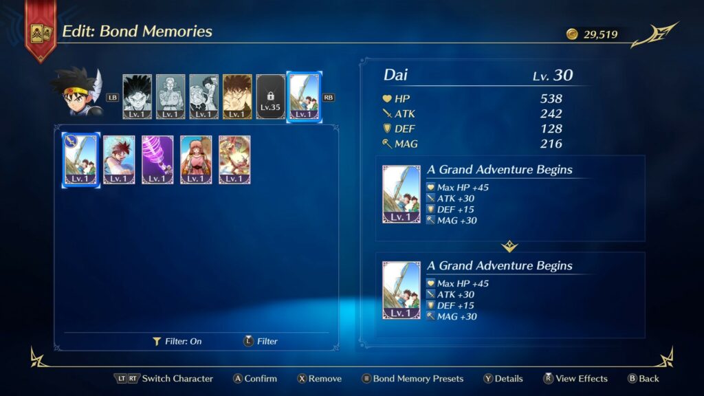 - Les personnages équipés de souvenirs verront leurs capacités s’améliorer de diverses façons, et ils pourront en utiliser davantage simultanément à mesure qu’ils gagneront des niveaux.