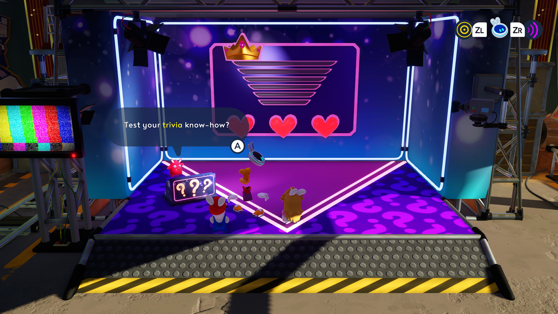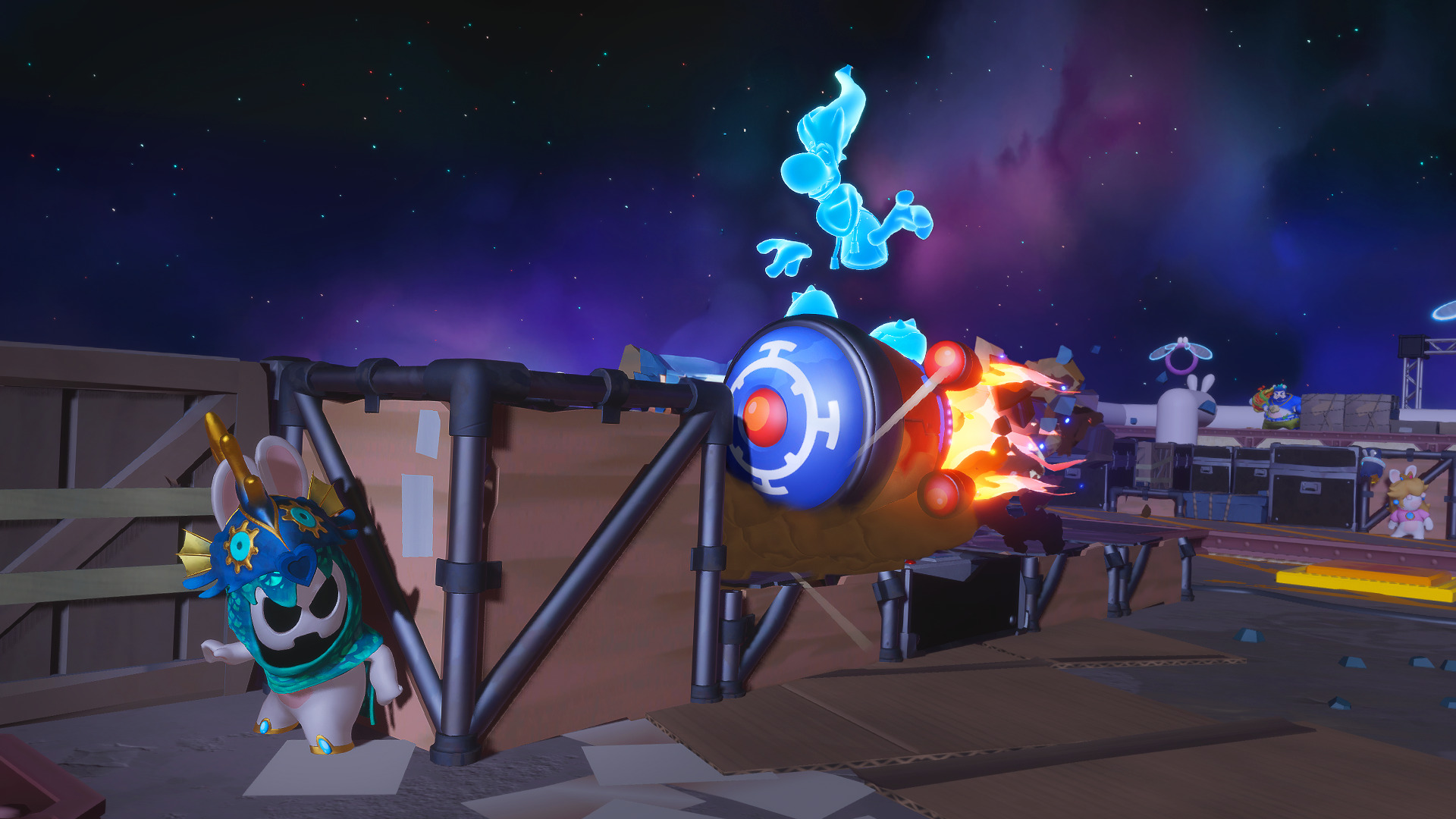 Dans cette toute nouvelle aventure séparée de l’histoire principale, les joueurs pourront incarner Rayman, Lapin Peach et Lapin Mario et partiront à la découverte du mystérieux studio de télévision Space Opera Network rempli d’accessoires et d’easter eggs. Les joueurs retrouveront également une veille connaissance, le Fantôme, désormais irréprochable directeur de ce studio.