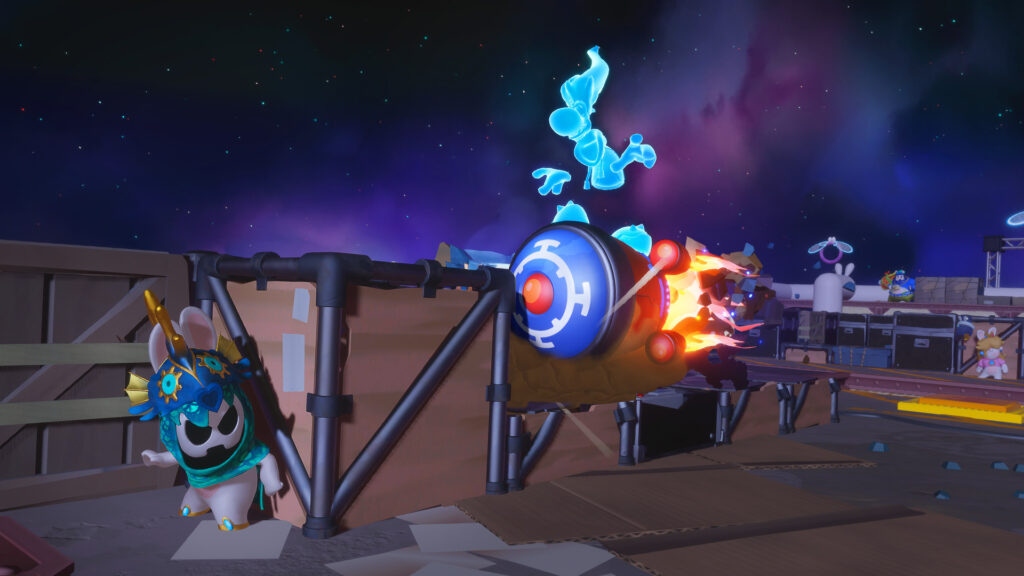 Dans cette toute nouvelle aventure séparée de l’histoire principale, les joueurs pourront incarner Rayman, Lapin Peach et Lapin Mario et partiront à la découverte du mystérieux studio de télévision Space Opera Network rempli d’accessoires et d’easter eggs. Les joueurs retrouveront également une veille connaissance, le Fantôme, désormais irréprochable directeur de ce studio.