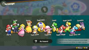 Un bonheur est rarement solitaire chez Nintendo… de fait, Mario ne part pas en solo dans cette quête florale, mais bel et bien accompagné de toute son équipe. Dans cet optique, le joueur est invité à sélectionner le personnage de son choix dès l’embauche de la partie. Le célèbre plombier, mais aussi son frère Luigi, ou encore une petite équipe de Toads et de Yoshis, sans oublier Daisy et Peach, moult Yoshis aux teintes variées, et même Carottin. Petite cerise sur le cupcake, les plus jeunes (ou les joueurs novices) sont clairement invités à prendre part à la partie même s’ils ne sont pas encore à l’aise sur ce genre de titre. En effet, la team Yoshi et le rigolo Carottin ne subissent pas de dégâts : la fête, la fête ! Aussi, les dinos anthropomorphes restent capables de gober tout ce qui est à portée de langue : de quoi s’amuser doublement une fois la manette en main.
