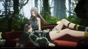 En restant sur cette comparaison, sur l’idée d’améliorer et de surpasser Crystar, la présentation globale de Crymachina est à première vue meilleure. Le moteur et la modélisation des personnages rappellent un peu The Caligula Effect 2, autre récente licence du studio Furyu. Un rendu des personnages moins chibi, pour quelque chose à échelle plus réelle avec pas mal de détails. La réalisation est Cel-shading 3D classique et revue dans le genre mais colorée, propre et séduisante. Des illustrations en 2D accompagnent les dialogues pour nous donner une meilleure impression de l’expression faciale difficilement visible in-game de chacun des personnages. Certaines illustrations et le chara-design sont très étranges, notamment des personnages avec des fronts très larges. La seule explication pour justifier cela de manière intentionnelle, serait de dire que ce sont des machines et que leur physique est imparfait.