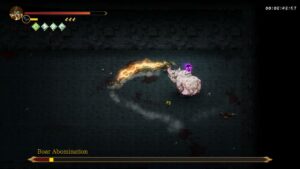 Ces récompenses sont de différents types : des âmes bleues qui sont la monnaie du jeu, de la récupération de vie, une arme, une relique ou une compétence. Parfois, pour obtenir votre gain, il faudra également vaincre un ennemi plus coriace, sorte de demi-boss. Ainsi, plus nous avançons, plus nous devenons forts. Mais si nous sommes vaincus c’est retour à la case départ ! Là encore, le jeu ne nous donne pas d’explications scénaristiques à ce phénomène mais passons. Une fois revenu à notre point de départ, nous pourrons dépenser des points durement gagnés lors de notre dernière tentative afin de nous donner un avantage lors de notre prochaine sortie. Nous sommes donc bel et bien dans un roguelite.