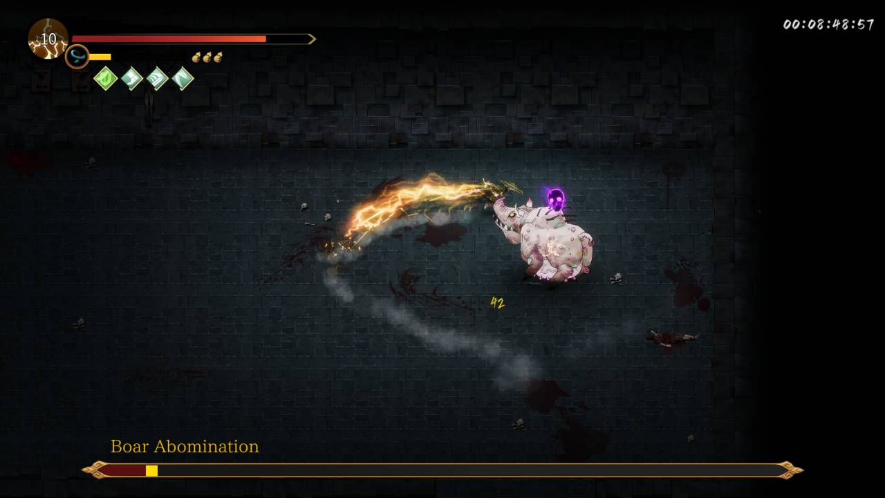 Une autre frustration au niveau du gameplay concerne les patterns des boss. Nous avons eu l’impression que le même schéma se reproduit régulièrement, quel que soit le boss. Celui-ci alterne les phases où il nous fonce dessus puis où il nous tire dessus à distance ou appelle d’autres ennemis. Finalement, pour conclure sur le gameplay, c’est plutôt bon en soit, mais nous aurions aimé le petit quelque chose en plus qui nous fait vibrer.