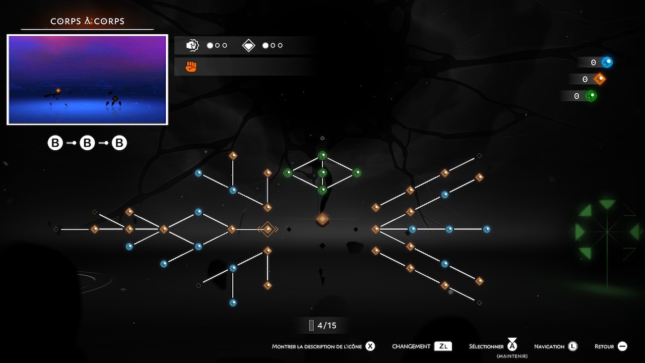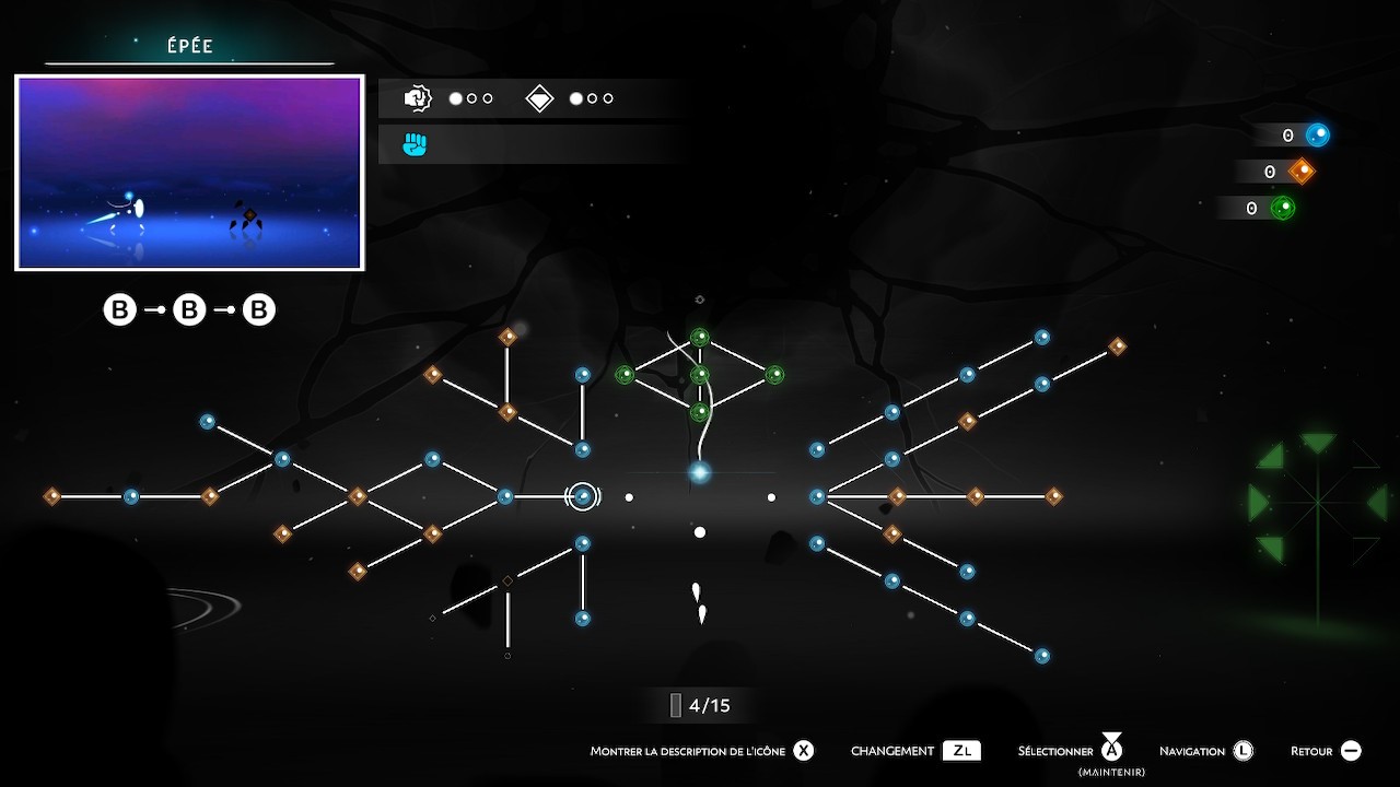 Worldless Eh oui, tout comme pour les mondes à parcourir, le système de compétences est incrémenté lui aussi sous forme de constellations : à droite les aspects magiques et de garde, à gauche les aspects physiques à l’épée ainsi que quelques autres compétences que nous ne dévoilerons pas ici et qu’il faudra découvrir par soi-même.