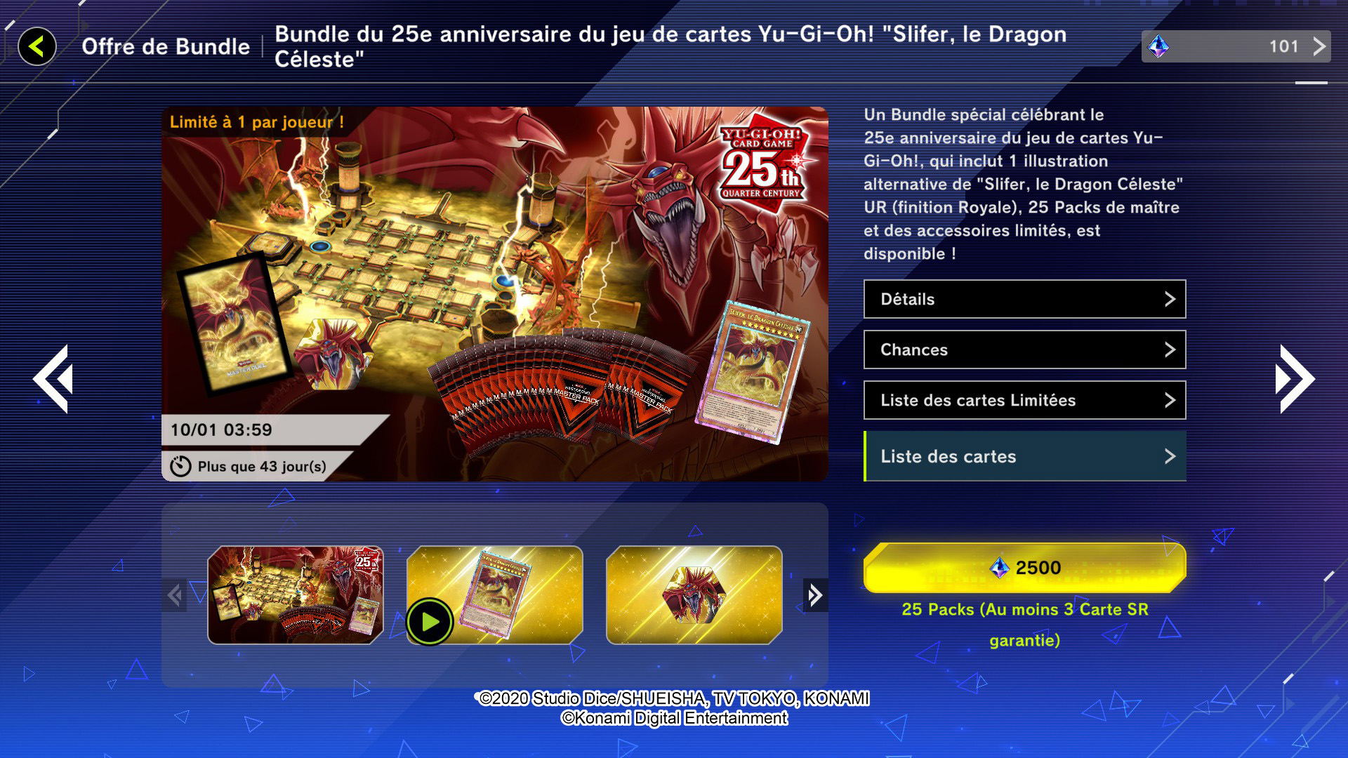 Le set complet, qui ne peut être acheté qu’une seule fois, comprend Slifer, le Dragon Céleste (Illustration Alternative) en Fini Royal, 25 Master Packs qui contiennent chacun 3 cartes SR, et trois objets Slifer, le Dragon Céleste : un Terrain de Duel, une Protection et une Icône. Le set complet est désormais disponible pour 2500 Gemmes.