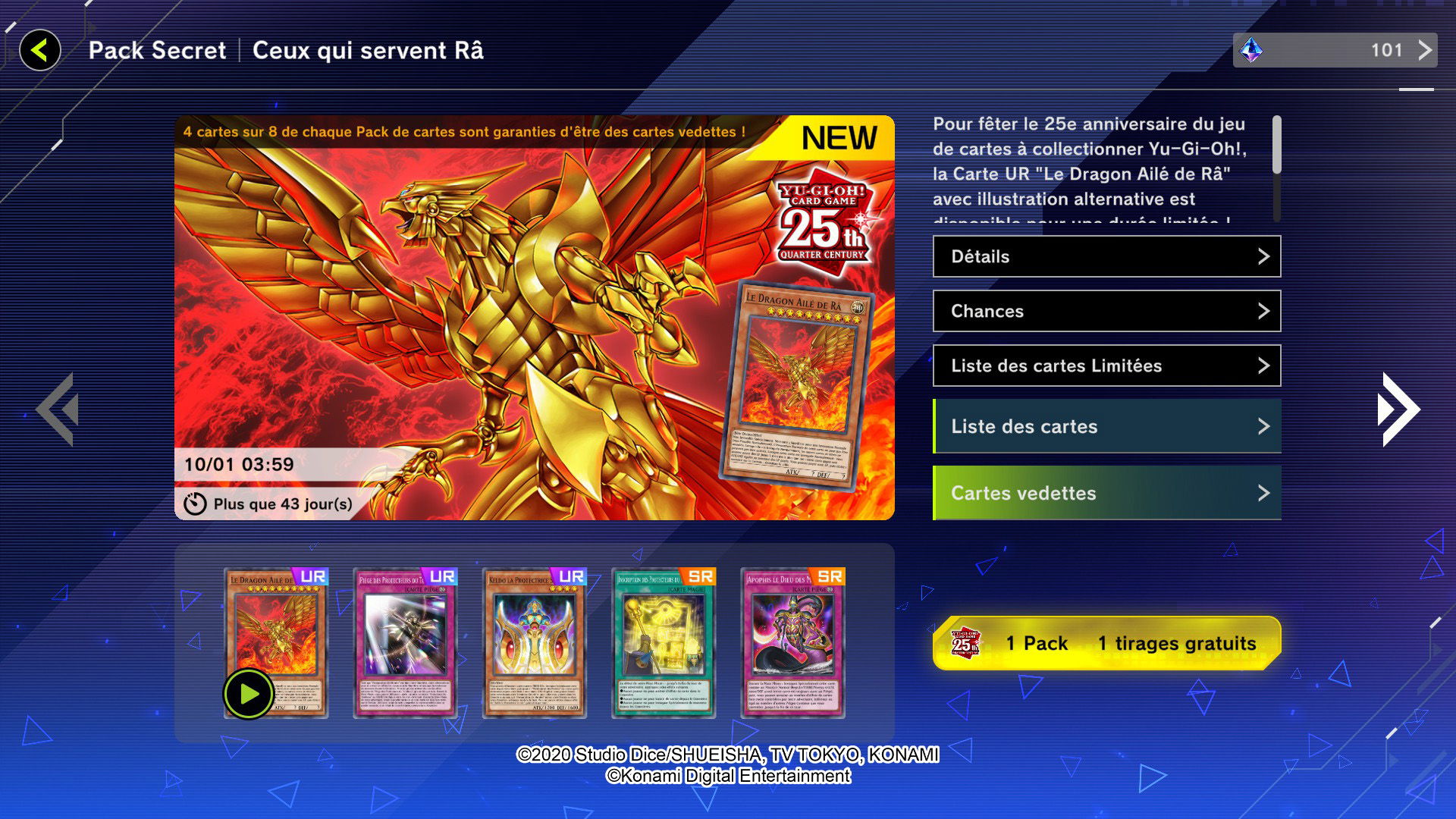 La troisième et dernière carte Dieu Égyptien peut être obtenue par le biais du tout nouveau Pack Secret « Ceux qui servent Râ ». Il est disponible dans la Boutique du 27 novembre 2023 au 10 janvier 2024, et offre une chance de mettre la main sur Le Dragon Ailé de Râ (Illustration Alternative). Les joueurs auront également l’occasion d’ouvrir un pack gratuitement durant sa période de disponibilité.