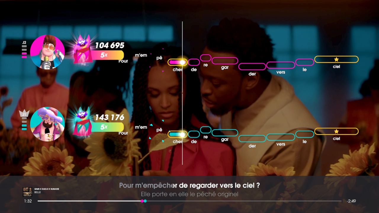 Un premier problème se pose alors rapidement : la lecture des paroles implique de poser son regard sur le bas de l’écran. Or la tonalité est, quant à elle, sur la partie centrale. Certes, les paroles sont aussi présentées sur les bâtonnets de justesse, mais l’écriture y est tellement petite qu’à moins de vous coller à l’écran, il ne sera pas possible de les lire… Si vous ne connaissez pas cette chanson il faudra donc choisir entre les paroles et la tonalité… ou vous contenter de La La La. Un bon choix stratégique, bien que manquant de fun (et d’équité face à ceux qui chantent vraiment !).