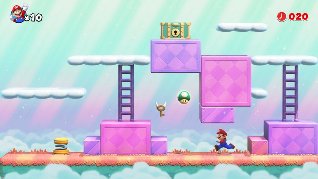 Et ce n’est pas tout : les stages bonus ont également été renouvelés. Si vous atteignez le coffre au trésor après avoir attrapé la clé fuyante avant la fin du temps imparti, vous pourrez mettre la main sur de nombreux champignons 1UP ! Enfin, il existe un défi Time Attack, qui se débloque lorsque certaines conditions sont remplies. Vous pouvez rejouer les étapes déjà parcourues afin d’essayer de trouver le chemin le plus court et de les parcourir le plus rapidement possible. Essayez de battre l’objectif de temps !