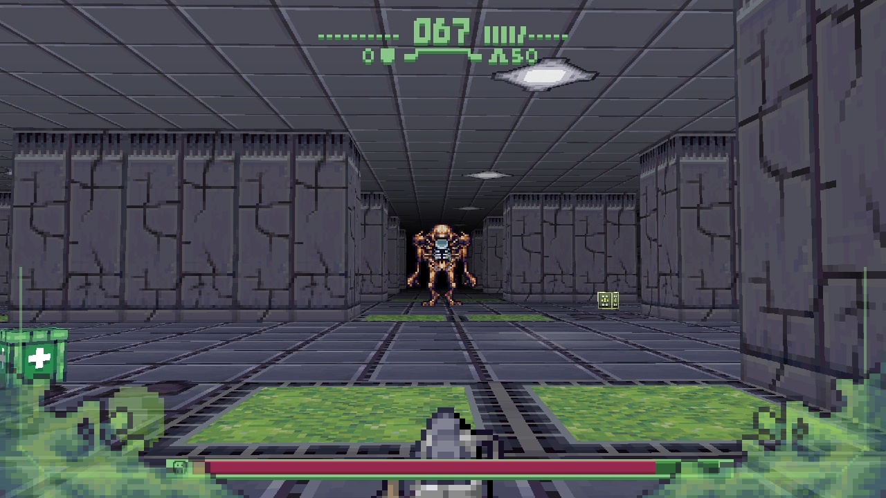 Le côté Wolfenstein 3D tient surtout par les décors très répétitifs, et par le côté très simple, voire simpliste des niveaux. De grandes salles, des couloirs et des angles droits partout. Le côté Doom se retrouve surtout dans le bestiaire avec des aliens moches qui explosent en gerbes d’entrailles verdâtres quand on les tue. Tout comme dans Doom, on contrôle le viseur de notre arme indépendamment de nos déplacements. Le stick gauche pour se déplacer et le stick droit pour diriger ses tirs.