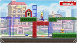 Allons plus en profondeur du gameplay et du concept de cette série provenant de Donkey Kong. Les niveaux proposent des mécanismes avec lesquels interagir faisant apparaitre ou disparaitre des éléments influençant notre avancée. Prenons l’exemple d’interrupteurs de couleur rouge, bleu et jaune. Nous ne pouvons qu’en activer un à la fois et ceux-ci sont la plupart du temps dispersés sur les niveaux. Un interrupteur activé fera apparaître des éléments de la couleur de celui-ci. Des plateformes ou des échelles parmi d’autres choses. Il s’agit de réfléchir au chemin à tracer à chaque niveau pour atteindre les interrupteurs, éventuellement ramasser les cadeaux mais surtout parvenir jusqu’au jouet.