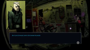 Cette première scène nous donne aussi l’occasion de se familiariser avec l’interface. Ici nous sommes en terrain connu : on déplace un curseur sur une scène fixe et selon où l’on clique, des actions contextuelles sont proposées. Ces actions sont la plupart du temps Observer, Utiliser, Prendre et Discuter. Nous disposons aussi d’un inventaire pour stocker les objets et d’un « pouvoir » lié à la nature surnaturelle de Bartholomeus : il peut scanner l’environnement afin de mettre en surbrillance tous les éléments interactifs de la scène, aussi bien les objets que les endroits où peut se rendre. Car oui, les codes les plus anciens du point’n’click sont respectés, on ne déplace pas directement son personnage mais on clique sur une partie de l’écran pour se déplacer d’une scène à l’autre. Cela contraste fortement avec le dynamisme des scènes en mode Comics.