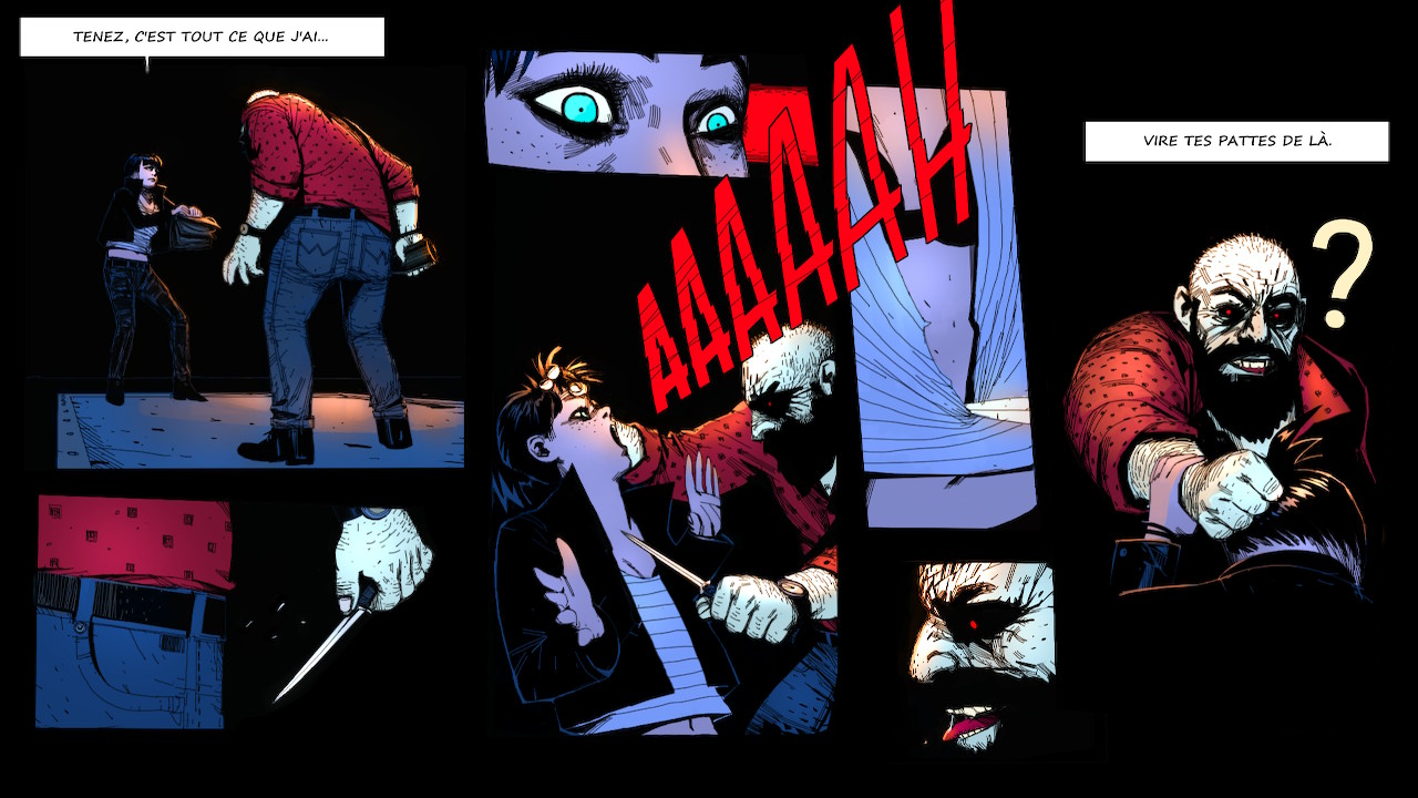 C’est vrai que lorsqu’on découvre le jeu pour la première fois, on a vraiment l’impression de lire un Comics. Cet aspect est renforcé par les séquences d’action du jeu, car oui il y en a ! Cela peut paraître antinomique avec le point’n’click mais Ars Goetia a eu la très bonne idée d’illustrer les séquences d’action par des cases et des bulles de dialogue. Le résultat est vraiment très réussi et permet à Ars Goetia de pallier la redondance que l’on rencontre parfois dans les point’n’click et de dynamiser son jeu. L’histoire en est ainsi plus complète et plus agréable à suivre.