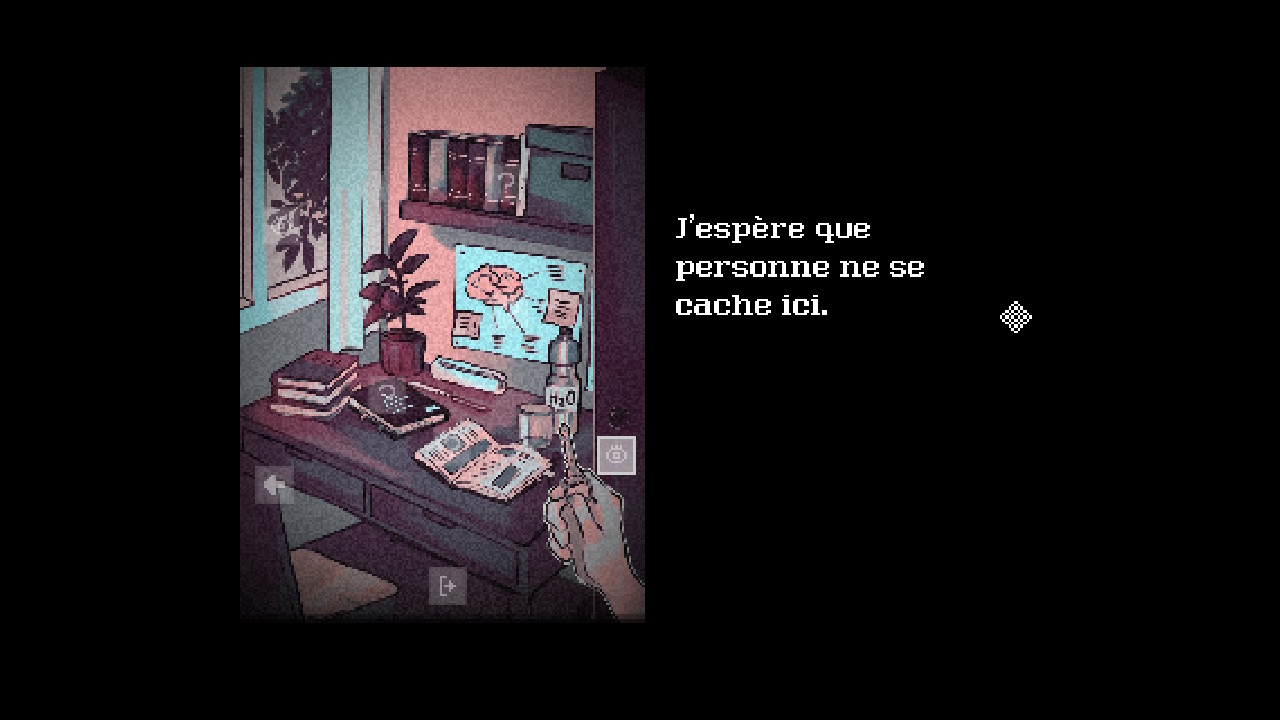 L’histoire nous tient en haleine du début à la fin. Nous voulons atteindre la fin de notre mésaventure tout en prenant le temps d’interagir avec chacun des éléments pour en apprendre plus sur la vie de notre personnage. D’ailleurs, en parlant de fin… il en existe deux ! Le dernier chapitre se divisera en fonction de vos actions et vous mènera vers une bonne ou une mauvaise fin. Bien évidemment, vous pourrez reprendre au chapitre précédent pour tenter d’obtenir l’autre fin. Une fois les deux fins débloquées, vous pourrez accéder à un mode bonus pour en apprendre un peu plus sur l’histoire de notre personnage. (Un petit easter egg s’y cache, d’ailleurs !) Comptez seulement 30 minutes pour finir l’aventure, et moins d’une heure pour débloquer l’autre fin et explorer à fond le mode bonus. Oui, c’est très court, même pour le prix.