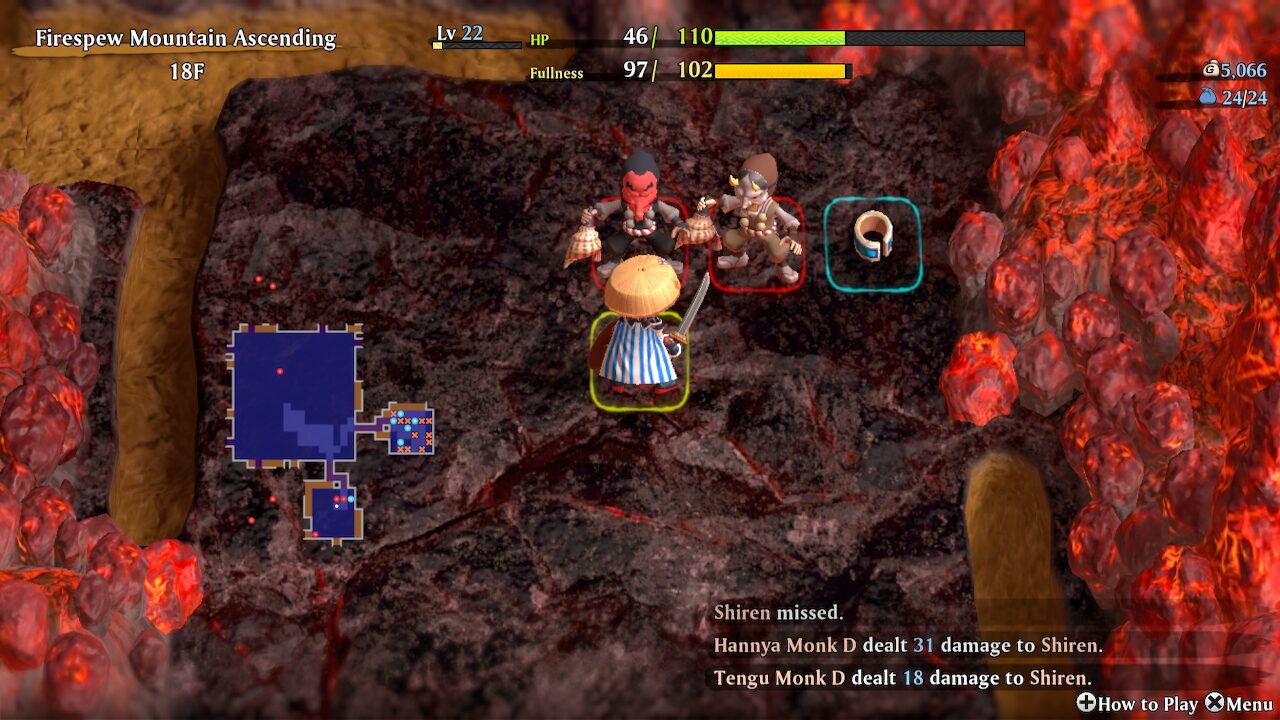 Nous démarrons ainsi le jeu alors que Shiren fait face à une des grandes menaces connues des aventuriers de l’ile Serpentcoil, au plus profond de la région. De nombreux autres monstres nous encerclent et nous sommes ainsi en très mauvaise posture. Soyons honnêtes, sauf si nous avons raté quelque chose, le résultat de cette intro est une défaite. Shiren est mystérieusement rapatrié en bas de la montagne surplombant la région. Après que les habitants nous aient fait un récapitulatif de leur situation et de la menace régnant sur la région, nous reprenons le contrôle de Shiren et nous reprenons notre ascension en repartant de zéro.