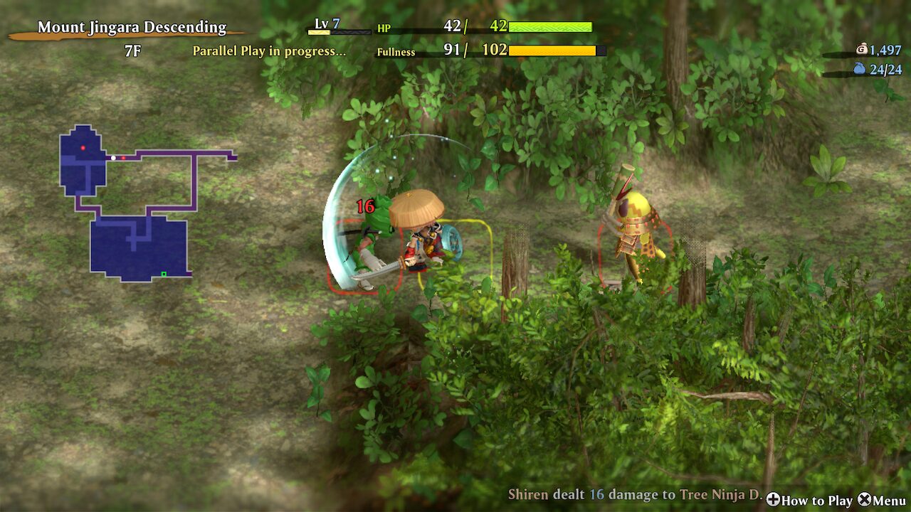 Cela fait plus de 10 ans que la licence Shiren est portée disparue au Japon. Son retour une décennie plus tard amène quelques subtilités à la formule afin de gagner en lisibilité et en confort. Les développeurs ont pensé à l’essor du streaming et aux joueurs s’attelant à cette activité. Ils proposent ainsi une UI et une interface que nous pouvons sélectionner pour avoir une interface moins lourde à visionner ou au contraire une interface bien plus riche en détails. Par ailleurs, ce gain de lisibilité et de visibilité se propage aux données affichées en jeu comme une indication sur le nombre d’objets dans l’inventaire, chose basique mais pas nécessairement une norme de la saga. Nous avons un affichage des logs du jeu plus agréable à lire et permettant de moins se perdre dans notre progression.