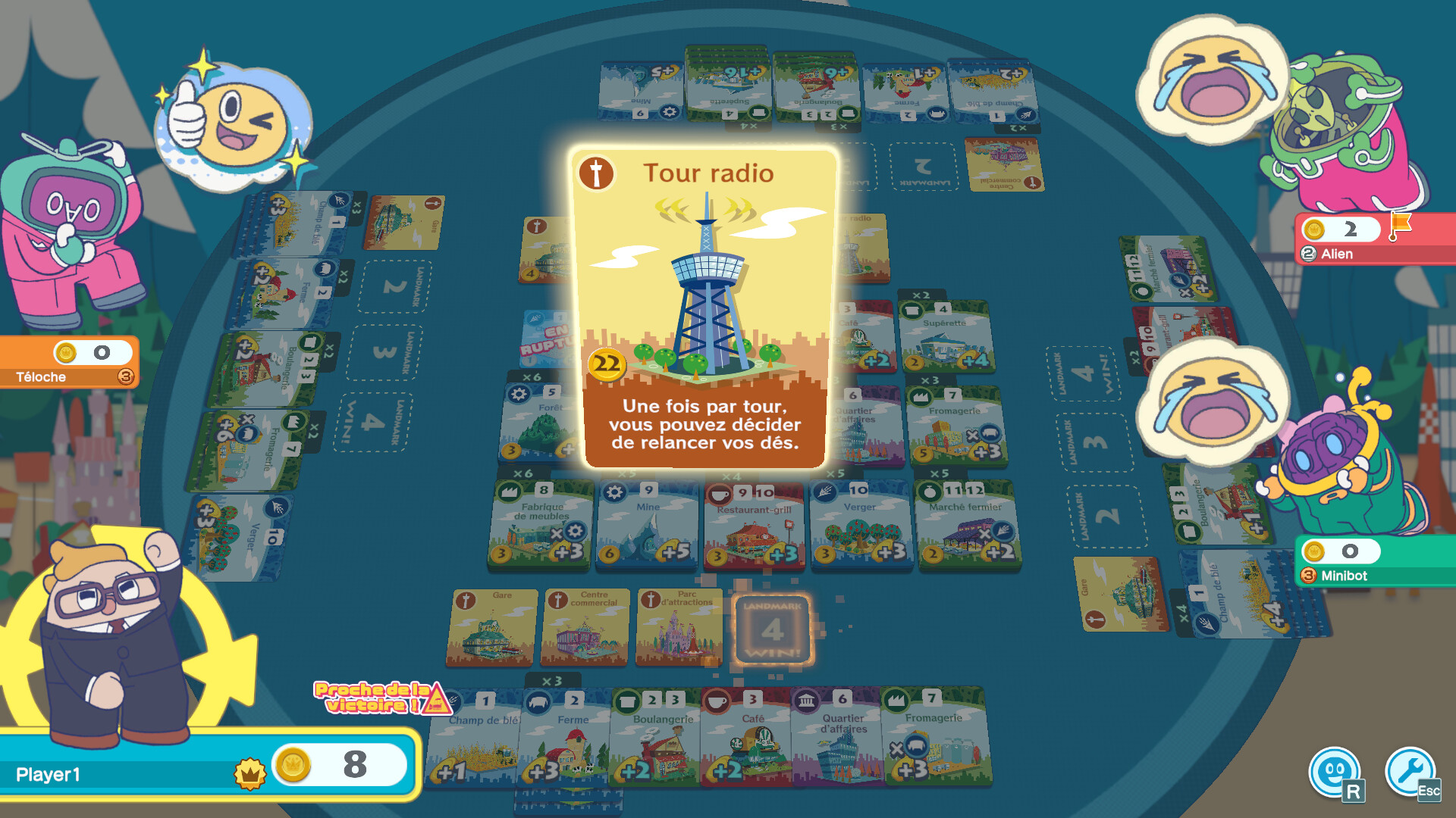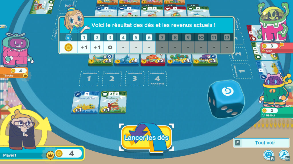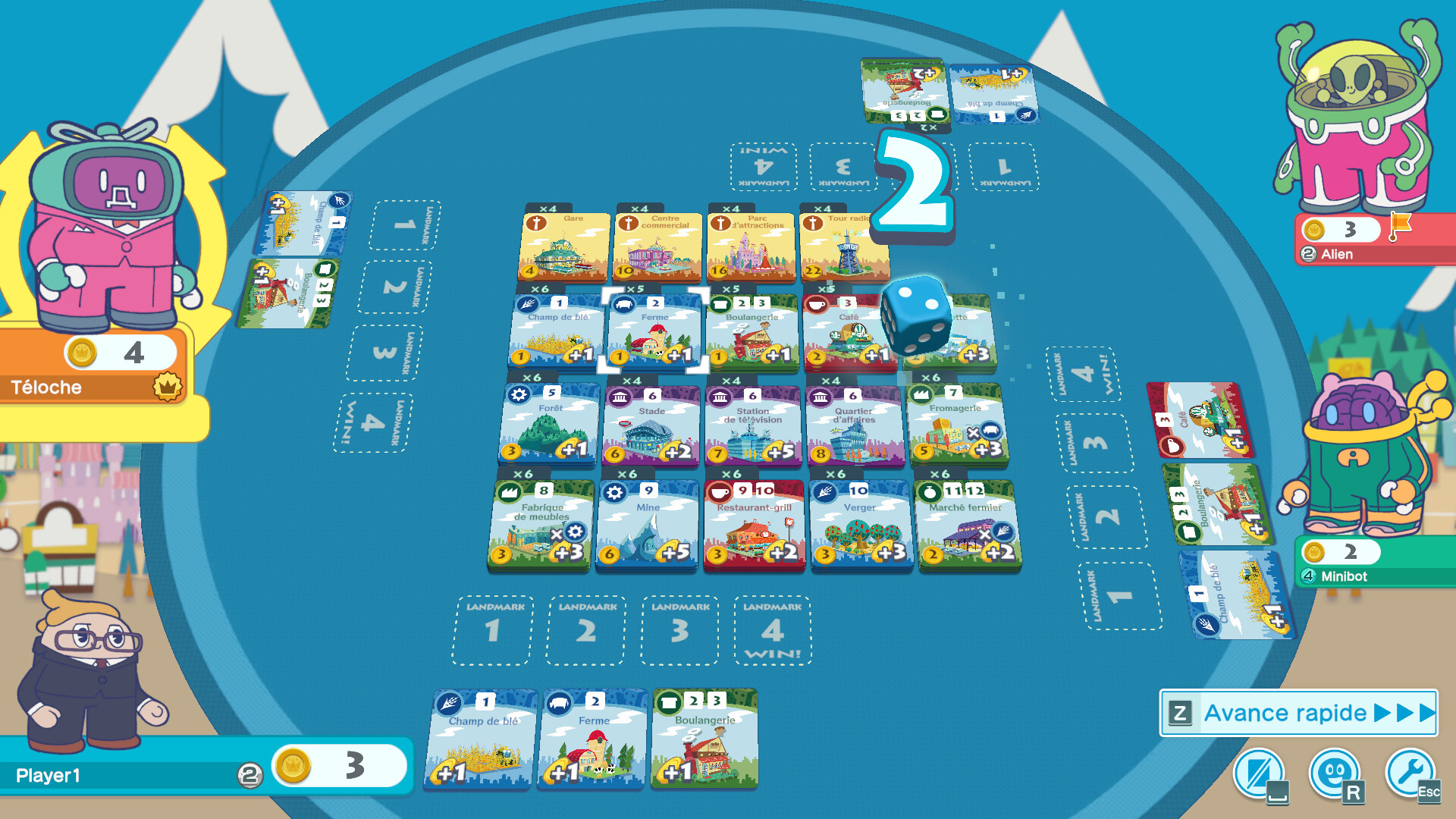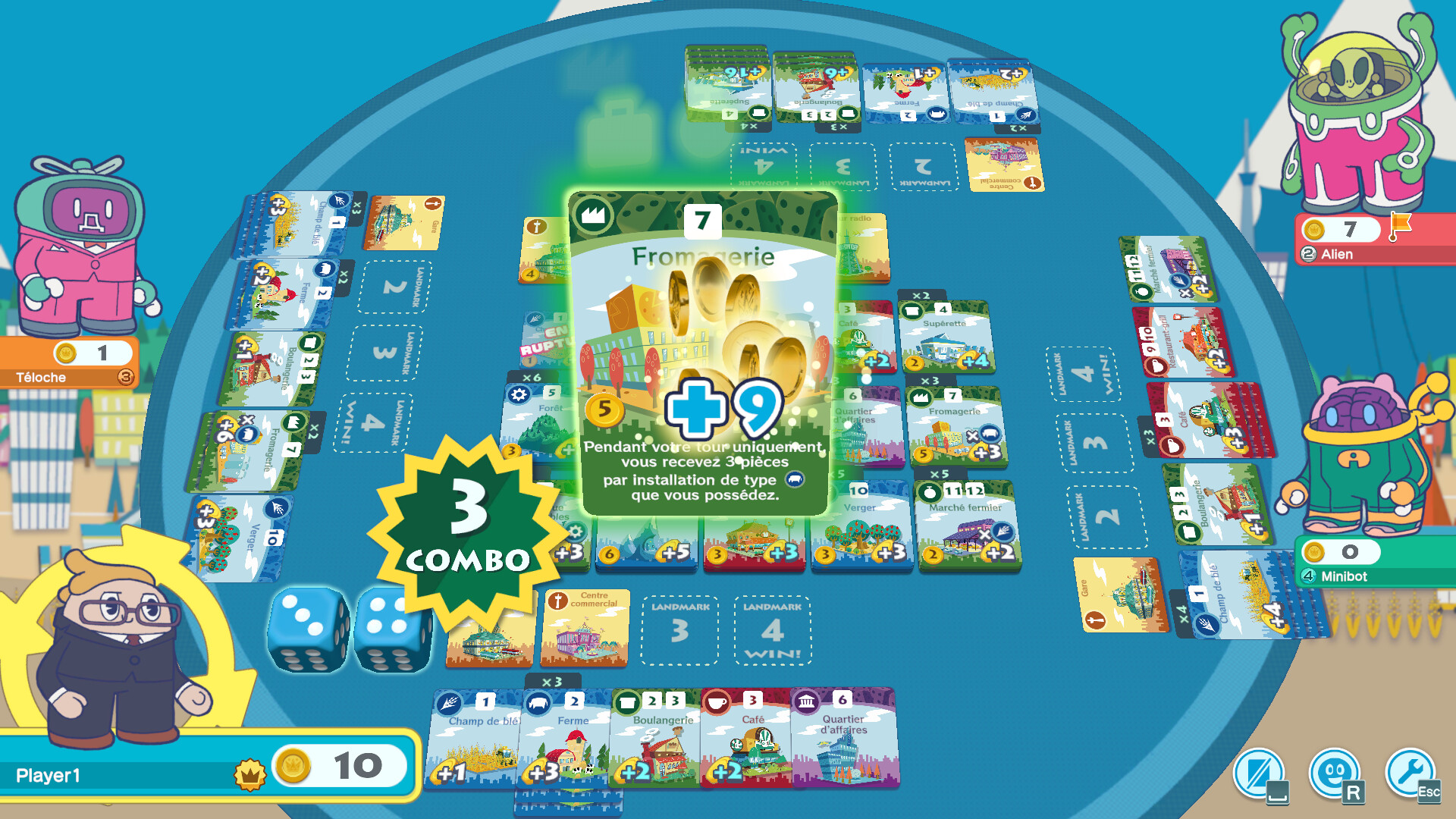 - Mécanique de jeu : À chaque tour, les joueurs lancent un ou deux dés, en fonction des cartes qu’ils possèdent. Les résultats des dés déterminent quelles cartes produisent des revenus pour chaque joueur. Ces revenus peuvent être utilisés pour acheter de nouveaux établissements ou pour activer des effets spéciaux.