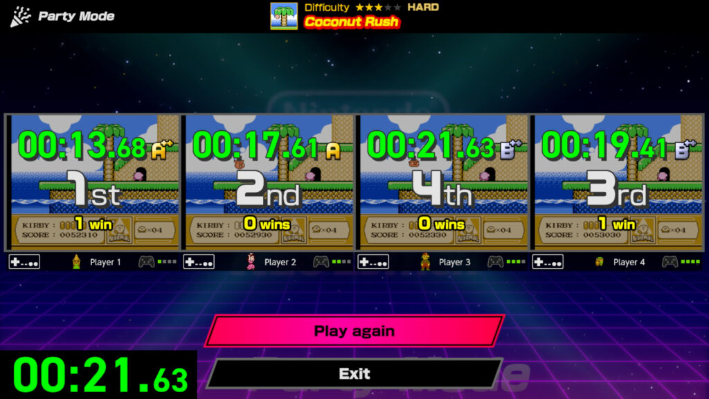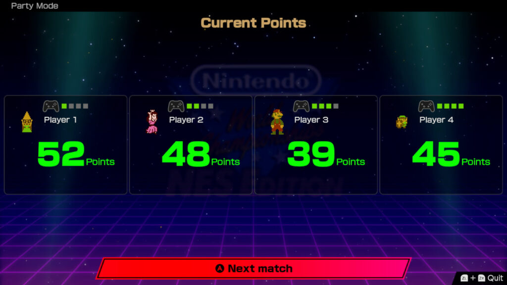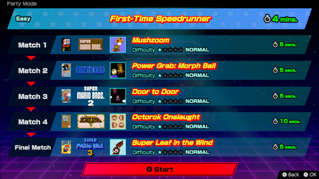 Rendant hommage aux inoubliables Nintendo World Championships organisés en 1990, 2015 et 2017, Nintendo World Championships: NES Edition met au défi les joueurs sur des segments de classiques du jeu vidéo. Les joueurs ‘old-school’ comme les joueurs des jeux les plus récents pourront profiter de plus de 150 défis contre-la-montre tirés de 13 grands classiques de la NES. Échauffez-vous en établissant et en battant vos propres temps en mode contre-la-montre, et en débloquant de nouveaux défis ainsi que des badges uniques dans le jeu. Lancez ensuite le mode multijoueur, dans lequel jusqu’à huit joueurs* peuvent s’affronter en local. Les abonnés au service Nintendo Switch Online** peuvent choisir le mode championnats du monde pour envoyer leurs meilleurs temps dans cinq défis qui changent chaque semaine et figurer dans les classements mondiaux.