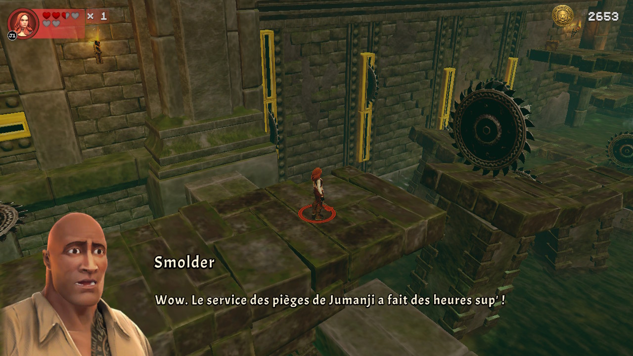 Mais ce n’est pas dans les affrontements que Jumanji parvient à tirer (un peu) son épingle du jeu, mais dans ses phases de plateformes ! Certains niveaux ont un level design vraiment bien pensé, qui jouera parfois avec votre courage d’aller au-delà de certains angles de caméra pour trouver des trésors (ou parfois la mort). On traverse certains obstacles en retenant son souffle et on se dit que le service des pièges de Jumanji s’est effectivement bien lâché ! Imaginez un tronc roulant, mais sur lequel se trouve une planche avec des clous qu’il faudra éviter en sautant, tout en esquivant des lames tranchantes projetées depuis les murs… Et ce n’est qu’un petit aperçu de ce qui vous attend ! Par chance, la maniabilité est au rendez-vous et si on loupe un saut, c’est que généralement, on s’est vraiment planté (heureusement)…