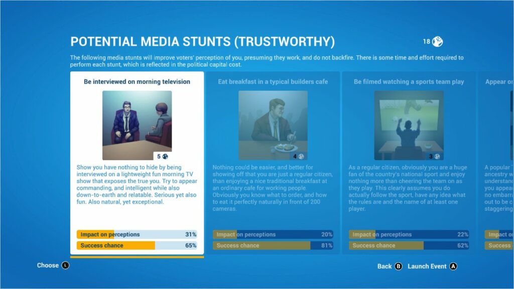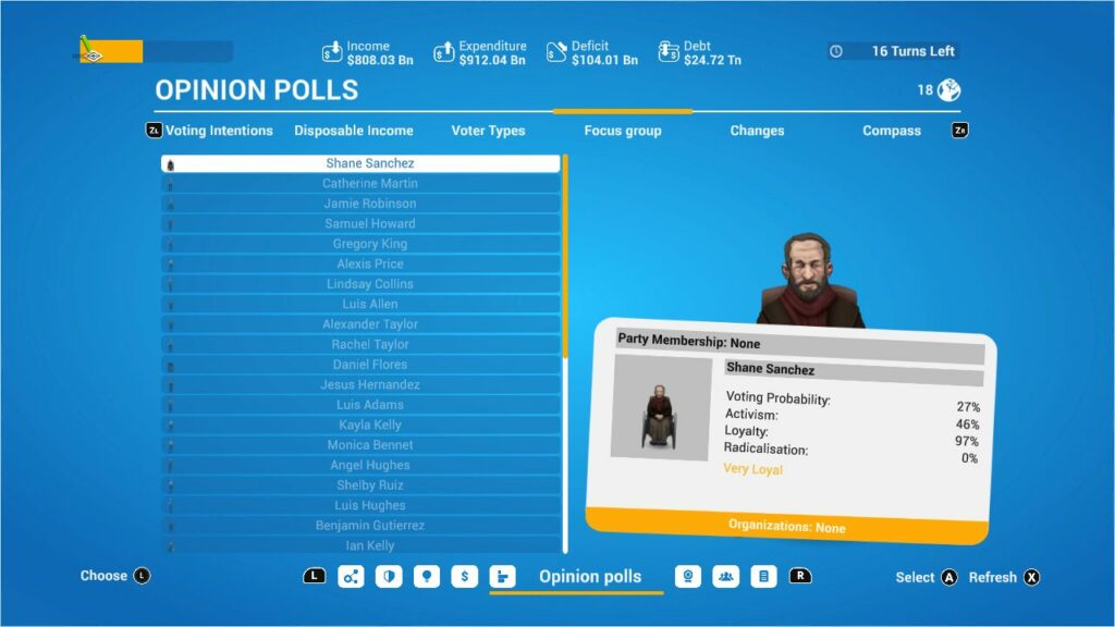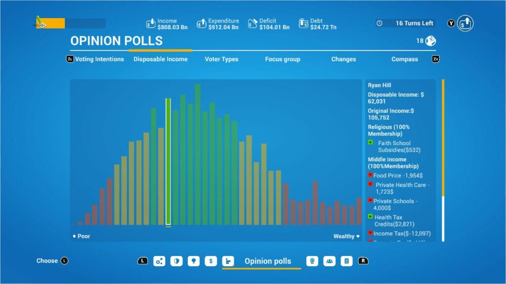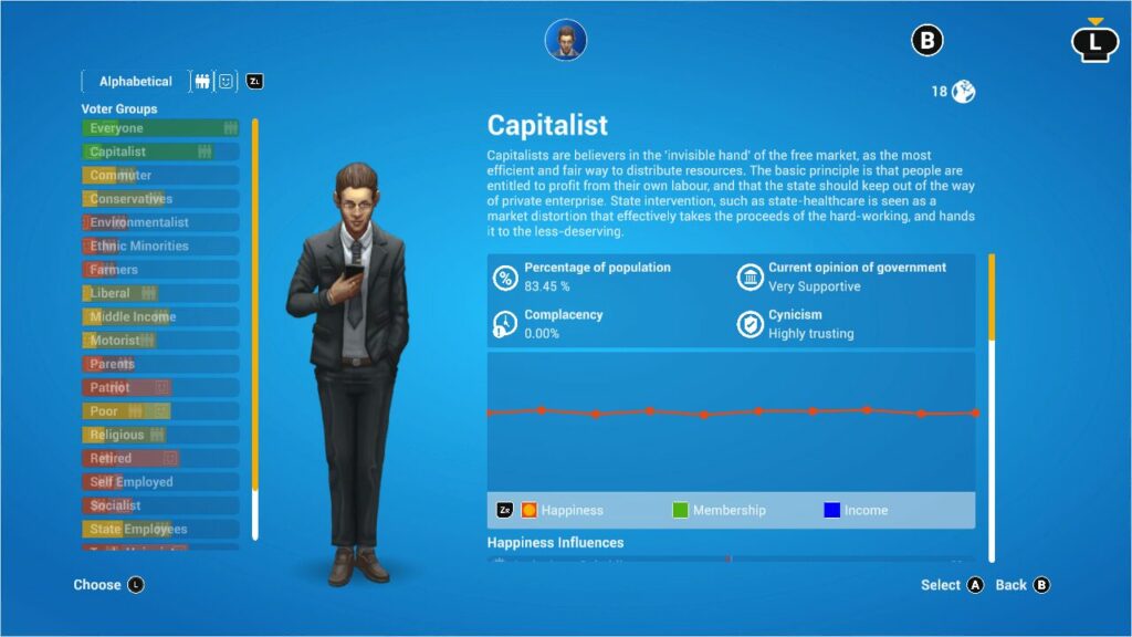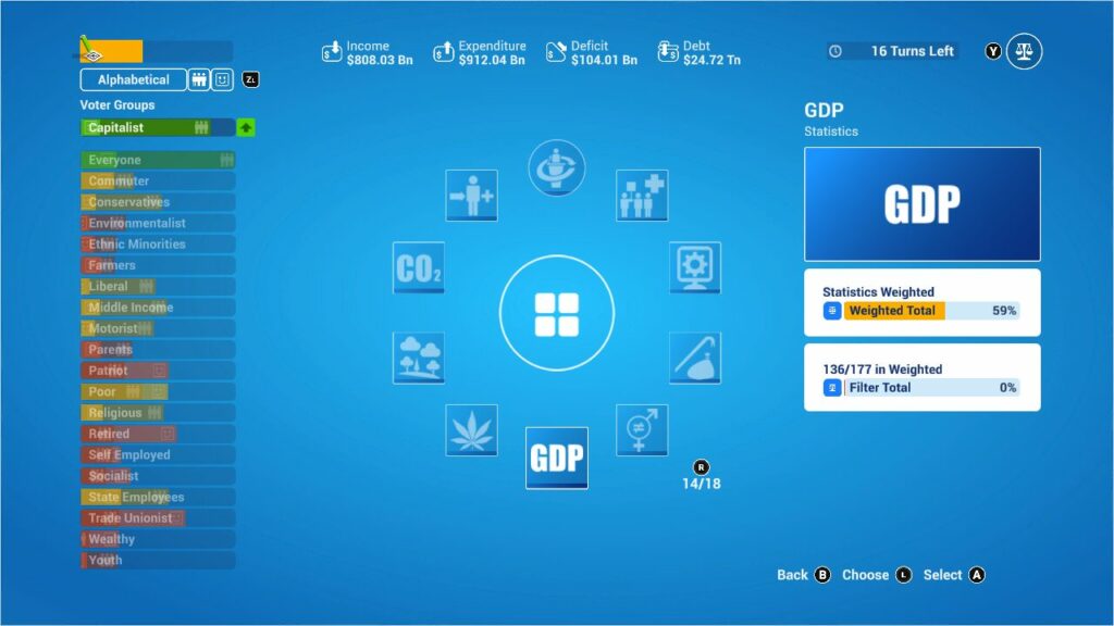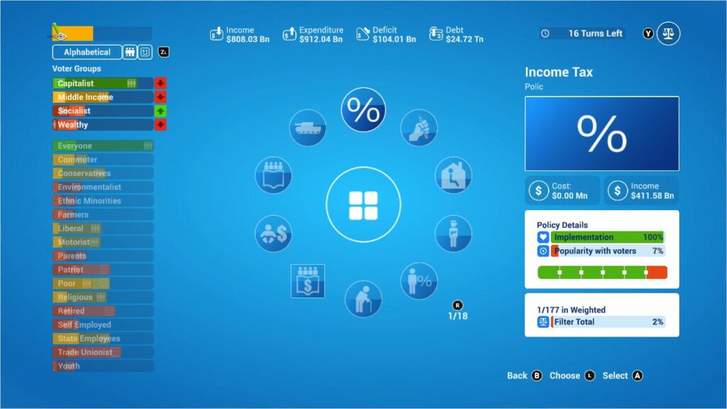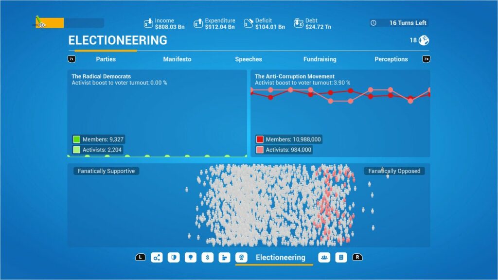 Dans Democracy 4 Console Edition, l’objectif n’est pas simplement de remporter les élections, mais de diriger votre pays. À moins de vous faire assassiner, perdre les élections n’est que la fin de la partie. Le véritable défi consiste à créer un pays qui vous inspire un sentiment de fierté.