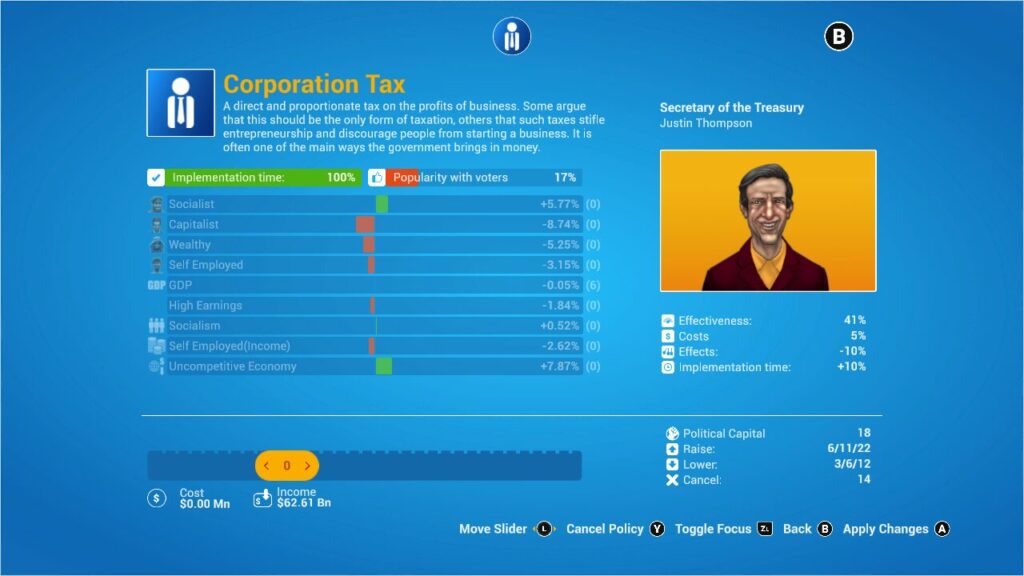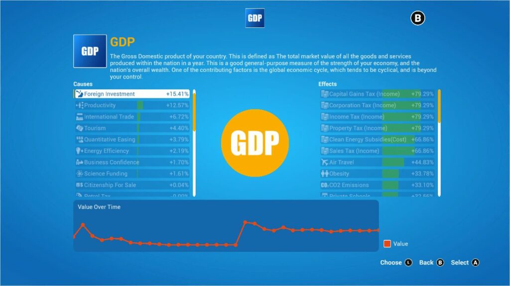 Il s’agit d’un jeu de stratégie dans lequel les conséquences de vos lois et décisions déterminent votre succès. Si vous voulez mettre un terme aux dépenses publiques et aux impôts, libre à vous. Selon votre façon de procéder, cette décision pourra s’avérer payante, ou non.