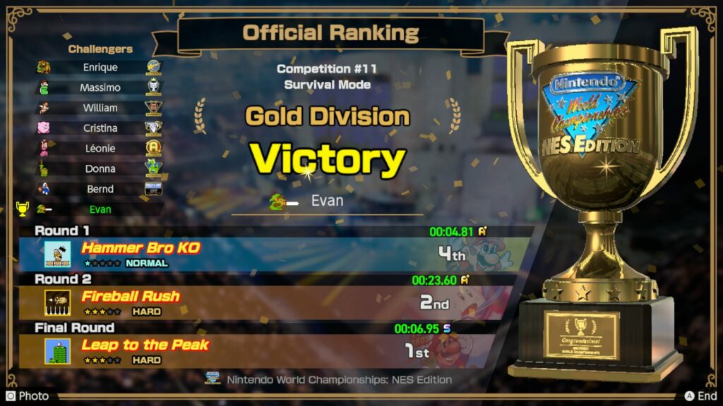 - Nintendo World Championships : NES Edition : vivez le frisson des championnats du monde Nintendo chez vous. Relevez plus de 150 défis de vitesse tirés de 13 jeux NES, mettez votre adresse à l’épreuve dans les défis de niveau Légende, comme en terminant Super Mario Bros. d’une traite du stage 1-1 au stage 8-4 en empruntant les tuyaux de téléportation, ou encore affrontez les fantômes de joueurs et joueuses du monde entier dans les tournois de survie. Un défi de niveau Légende vous donne du fil à retordre ? Jetez un œil aux infos confidentielles pour y trouver des astuces utiles. Jouez en solo, publiez votre meilleur temps dans les classements en ligne*1 ou bien encore jouez jusqu’à huit ensemble sur une même console en multijoueur local*2. Nintendo World Championships : NES Edition fera son arrivée le 18 juillet sur Nintendo Switch. La version numérique du jeu est d’ores et déjà disponible en précommande sur le Nintendo eShop.
