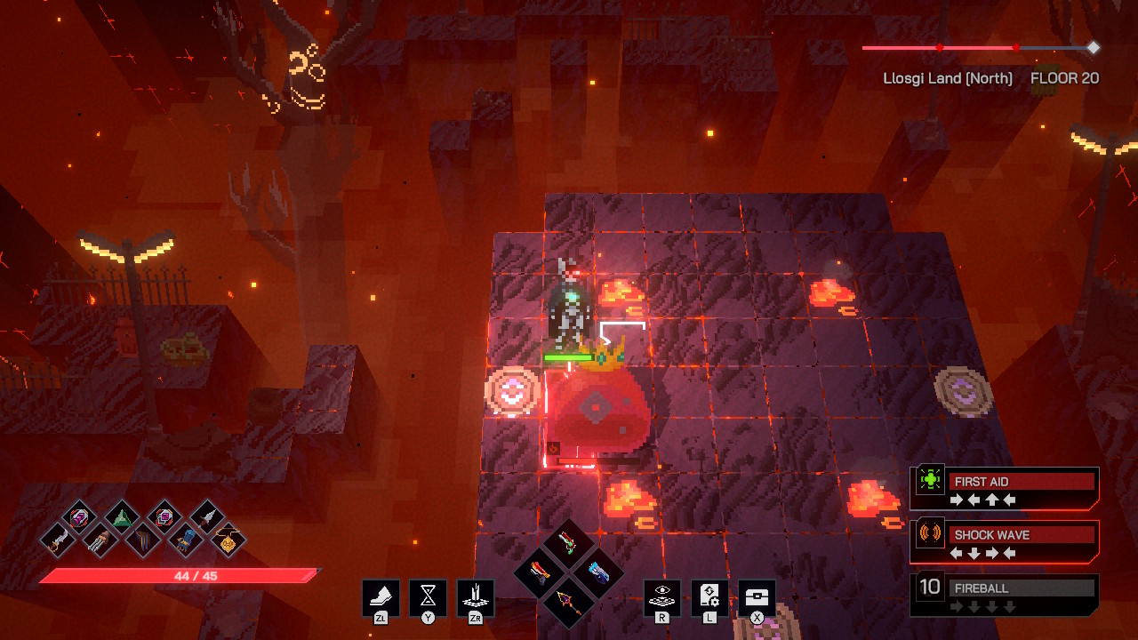 Concernant le système de combat, nous sommes sur du tour par tour semblable au jeu Crown Trick, dont le test se trouve ici. Vous ne connaissez pas Crown Trick ? Alors laissez-moi vous expliquer. Notre personnage peut se déplacer en haut, en bas, à droite, et à gauche, une case à la fois (sauf pouvoir particulier). Tant que nous n’avons pas bougé, nos ennemis ne font rien. Nous possédons jusqu’à 4 armes, une pour chaque direction. Ainsi, si nous possédons une épée pour la direction droite et que nous allons dans cette direction, s’il y a un ennemi, nous frapperons avec cette épée. Mais si nous voulons utiliser notre magnifique pistolet surpuissant qui se trouve à gauche, il faudra faire en sorte que notre ennemi soit à notre gauche. Vous l’aurez donc deviné, le positionnement de notre personnage est d’une importance cruciale dans The Land Beneath Us.