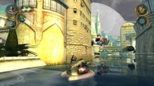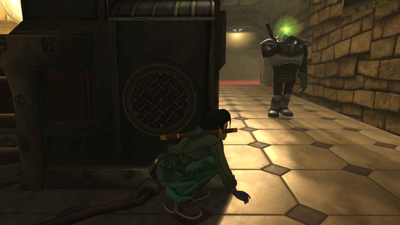 Pour ceux qui l’ignoreraient, Beyond Good and Evil est un jeu d’action aventure avec un gameplay au service de l’histoire ! Il propose un open-world à parcourir pour accomplir les différentes missions qui nous sont confiées, mais en proposant un gameplay très varié. Ainsi, il y aura des phases d’affrontements à coup de daï-jo (un bâton) avec un gameplay qui n’est pas sans rappeler Ocarina Of Time. En effet, notre héroïne ciblera automatiquement l’adversaire le plus proche et aura la possibilité d’esquiver les coups, mais aussi de lancer une super attaque tournoyante qui rappellera un peu celle de Link… Mais Beyond Good and Evil ce n’est pas que cela ! En effet, outre les phases de combat, vous serez aussi libre d’explorer Hyllis sur l’eau dans votre hovercraft, ou encore de flâner à pied dans les rues du quartier piéton. Libre à vous alors d’aller faire une partie de palet contre Francis, le requin humanoïde, ou de multiplier vos crédits grâce à une session de bonneteau avec Belle-mirette. Vous pourrez également profiter de votre exploration pour prendre en photo des espèces animales ou partir en quête d’une perle (l’autre monnaie d’échange pour améliorer votre moyen de transport). Il arrive d’ailleurs parfois que l’on trouve un passage secret derrière une armoire, qui vous conduira vers une zone remplie de plateformes au terme de laquelle vous pourrez gagner une précieuse perle… Certaines phases font également la part belle à l’infiltration, pas forcément du niveau d’un Metal Gear Solid, mais suffisamment intéressantes pour renouveler le gameplay… Il est d’ailleurs parfois plus plaisant de franchir un passage en faisant preuve d’analyse et de discrétion (faisant ainsi preuve de non-violence), plutôt que d’affronter des gardes en armure pour un combat perdu d’avance ! Et si cela ne suffisait pas, vous pourrez également vous lancer dans la compétition, avec les courses en hovercraft qui font rage sur Hyllis (4 sont au programme), avec un challenge à chaque fois plus relevé qui vous obligera à faire évoluer votre vaisseau pour espérer finir en tête.