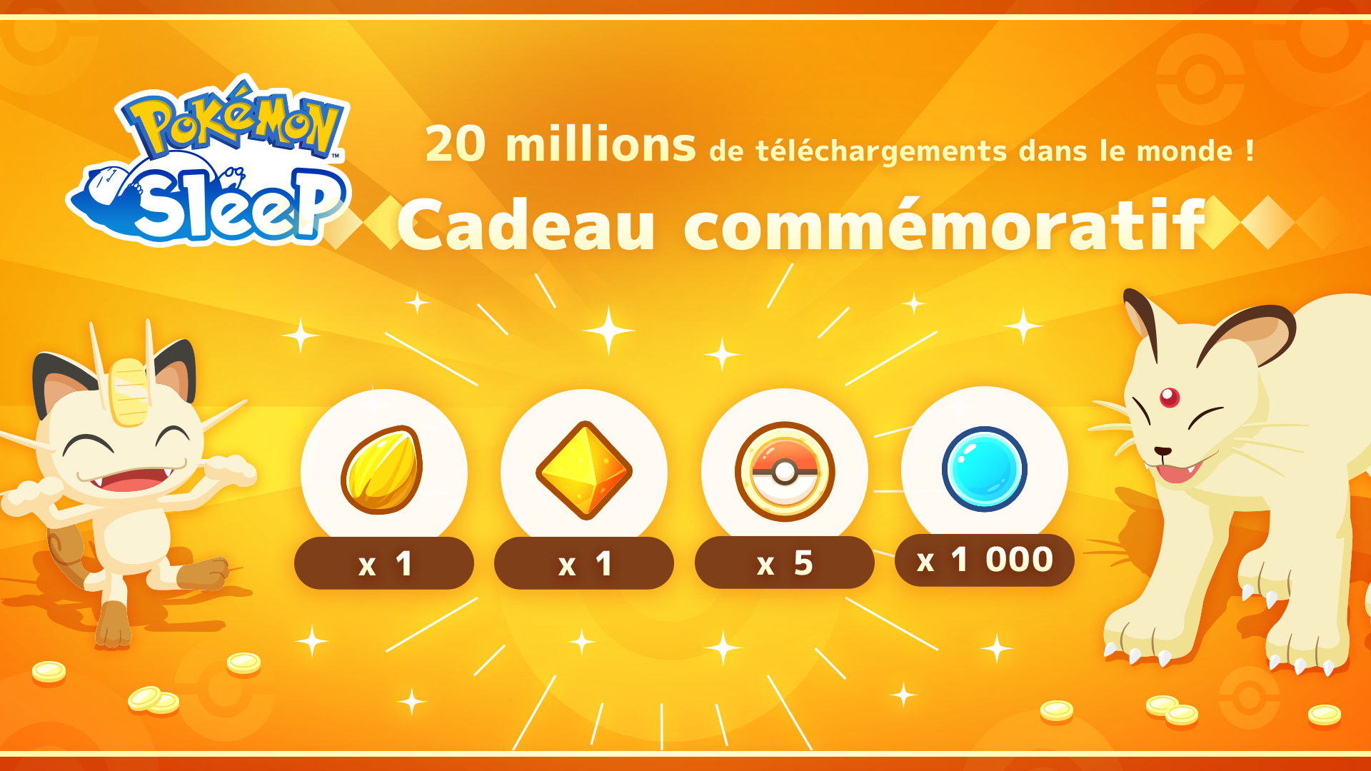 Afin de célébrer les 20 millions de téléchargements, les cadeaux suivants sont actuellement disponibles en jeu pour tous les joueurs et joueuses de Pokémon Sleep jusqu’au lundi 26 août à 04:00 UTC.