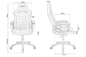 La couleur du siège testé est vert/noir. Comme vous pouvez le voir un peu plus haut, de nombreux combos de couleur sont disponibles. La chaise est construite avec des matériaux de haute qualité, offrant à la fois durabilité et esthétique. Facile d’entretien, le revêtement en simili cuir, vient recouvrir une mousse dense, pour un maximum de confort, quelle que soit votre morphologie. Le fauteuil propose une assise de 52 par 51 cm.