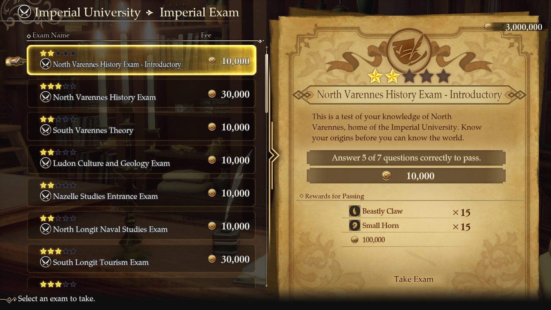 L’Université Impériale permet aux joueurs de passer des examens impériaux, testant leurs connaissances dans une variété de sujets différents. Réussir ces examens peut rapporter des matériaux d’artisanat et des couronnes (la monnaie du jeu).