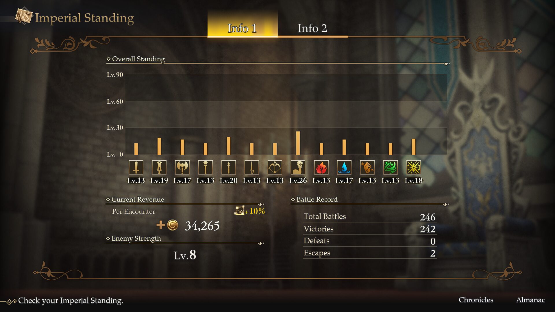 Cette fonctionnalité permet aux joueurs de vérifier le niveau global des armes et des écoles de sorts de l’Empire. La position globale augmentera tant que les armes et les sorts seront utilisés en combat et que leurs niveaux seront augmentés. À mesure que la position globale de l’Empire augmente, le niveau de base et la force des nouveaux membres de la suite recrutables dans les tavernes augmentent également.