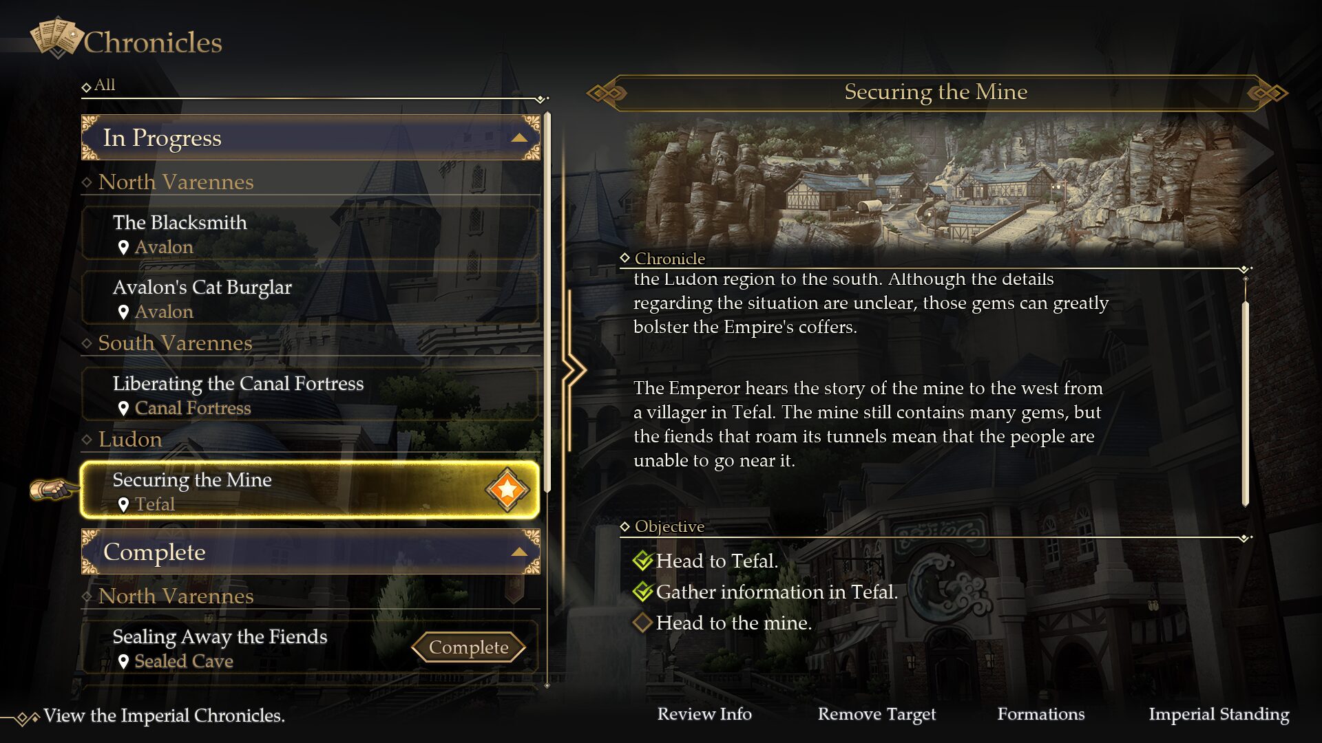 Les Chroniques Impériales permettent aux joueurs de voir un enregistrement de tout ce qu’ils ont accompli dans l’histoire jusqu’à présent, ainsi que les prochains objectifs possibles (c’est-à-dire les quêtes actuelles et terminées). Sélectionner une quête en cours la marquera sur la carte du monde et sur le terrain, guidant le joueur vers l’endroit où aller ensuite.
