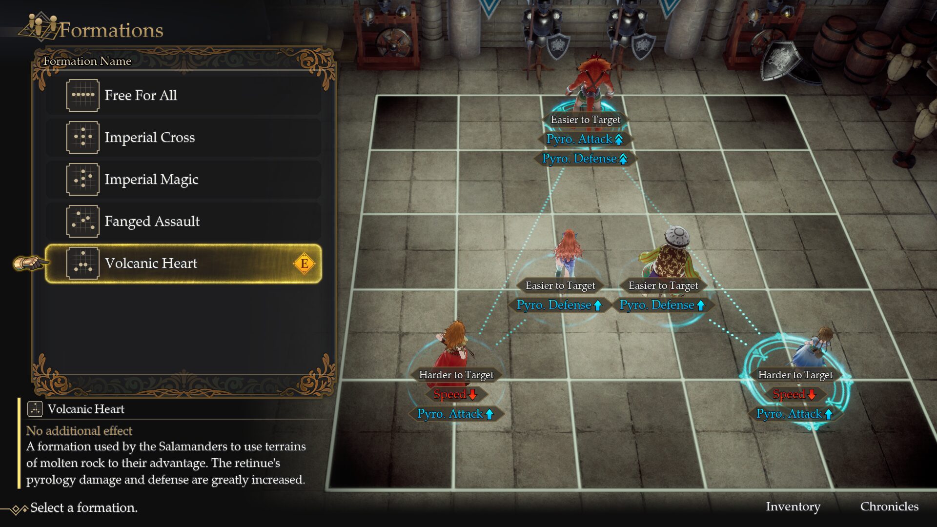 • Volcanic Heart : Peut être appris lorsqu’un Salamandre est nommé Empereur. Toutes les unités reçoivent un boost significatif de puissance offensive et de défense magique contre les sorts de pyrologie.