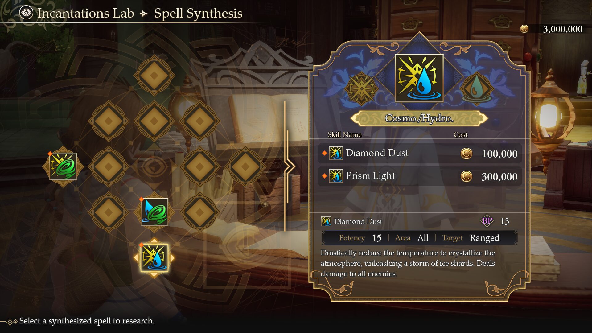 Les joueurs peuvent également développer des sorts « synthétisés » puissants—des sorts combinant deux éléments différents—en trouvant de vieux livres cachés dans les donjons et dans le monde extérieur.