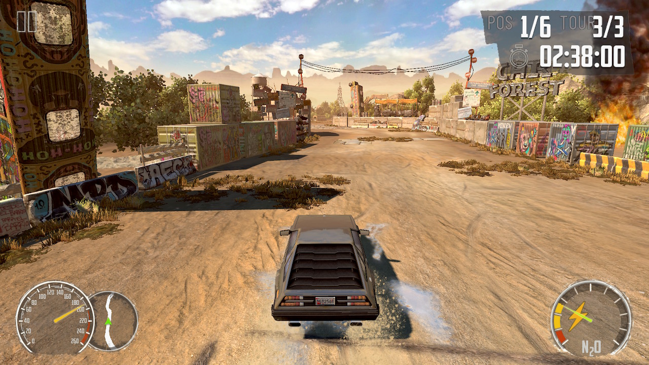 Outre le peu de modes différents, il faut aussi noter le faible nombre de circuits disponibles : douze, oui, mais qui se regroupent si l’on regarde bien en seulement quatre environnements distincts entre forêt, désert, ville et circuit de course. C’est un peu mieux du côté des véhicules, avec seize modèles qui sont en revanche quant à eux un peu plus variés. Il n’y a (bien sûr) pas de licences officielles, mais les amateurs d’automobiles reconnaîtront sans peine les modèles réels qui ont servi d’inspiration : Porsche Macan, Dodge Charger, De Lorean DMC 12, Chevrolet Corvette C4 ou encore Alfa Romeo Giulia Sprint. Le panel est plutôt diversifié, d’autant que vous pourrez, une fois les modèles achetés avec les crédits amassés en jouant, améliorer ceux-ci. Non seulement esthétiquement avec différents modèles de jantes, différents coloris ou encore différents stickers à apposer sur la carrosserie, mais aussi avec des améliorations mécaniques pour le moteur, les freins et la capacité de nitro embarquée.