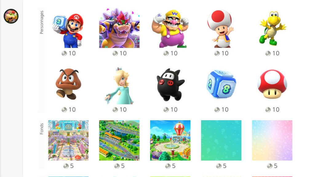Mais ce n’est pas tout ! Cette semaine marque aussi la première vague d’icônes Super Mario Party Jamboree. On y trouve 10 personnages dont Mario, Bowser, Wario, Toad, Koopa, Goomba, Harmonie, Ninji, un dé et un super champi. Avec eux, 5 fonds sont proposés (dont certains montrant différents plateaux du jeu) ainsi que 5 cadres. Le tout vous coûtera 150 points platine.