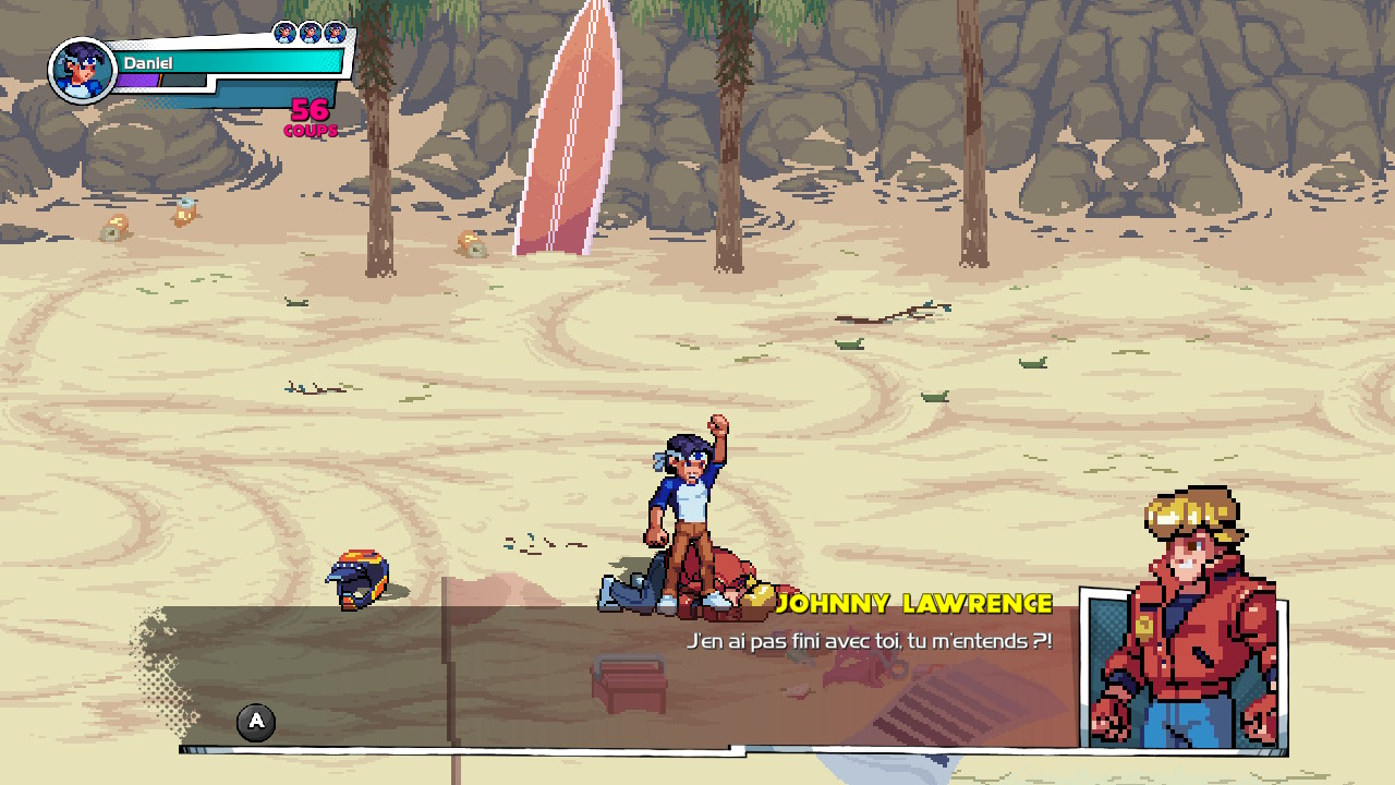 Vous l’aurez compris, ce nouvel opus ne déroge pas à la règle et propose encore une fois d’affronter une planquée d’ennemis à travers un beat them all. Il faut d’ailleurs dire que c’est très certainement la façon la plus évident de retranscrire une histoire mettant en avant des combats d’arts martiaux. Notre histoire début donc avec le début de Karaté Kid et l’arrivée de Daniel en Californie… De sa première rencontre avec Allie et de son premier affrontement contre Johnny. L’histoire nous est d’ailleurs contée via des cinématiques façon diaporama, avec des illustrations type livres pour enfants. Qu’à cela ne tienne, celles-ci bénéficient des textes en Français, ce qui est déjà une bonne chose. Par contre, il faut admettre qu’elles tranchent avec le pixel art, d’excellente qualité, que propose le jeu. Le déroulement reste très classique, on évolue vers la droite et on défonce les ennemis qui arrivent de tous les côtés. Nous ne l’avons pas précisé, mais il est possible d’incarner 4 personnages différents. Daniel (forcément), M. Myagi, Ali Mills et Kimiko. Néanmoins, ce choix n’aura aucun impact sur l’histoire, car au final nous suivrons l’aventure de Daniel à travers les mêmes cinématiques sur l’ensemble des niveaux traversés.