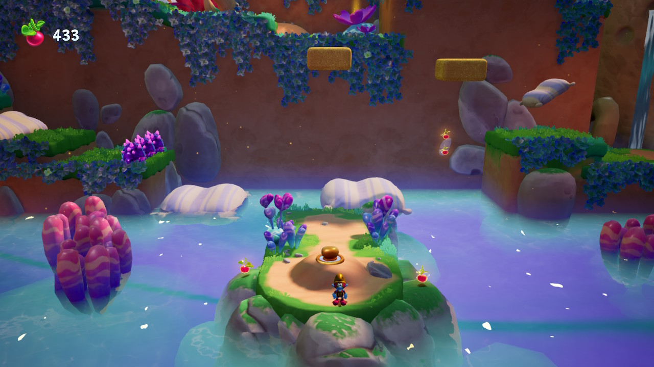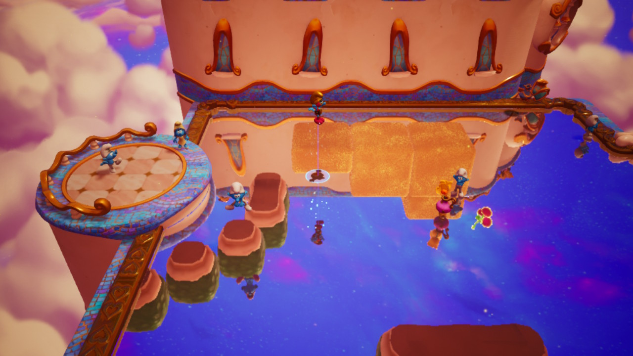 De façon générale, le déroulé d’un niveau est toujours le même. Ils pour la majorité représentés par des zones flottantes dans les airs (logique encore une fois, car nous sommes dans des rêves). Il faudra donc faire attention à ne pas chuter dans le vide en longeant les extrémités (ou en loupant un saut), sachez toutefois que notre personnage dispose de vies infinies et que les points de contrôle sont relativement nombreux et bien positionnés pour ne pas avoir à rager après un saut raté. Surtout que tout est fait pour ne pas manquer son point d’atterrissage ! Après un saut, un petit curseur apparaît au sol pour indiquer où notre Schtroumpf va atterrir ; une bonne initiative, dans un monde où il n’est pas possible de faire tourner la caméra autour du personnage et où la distance d’affichage est parfois un peu lointaine.