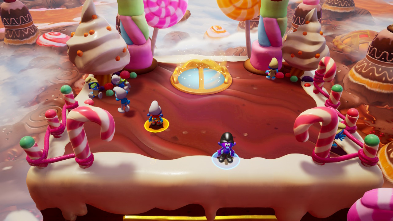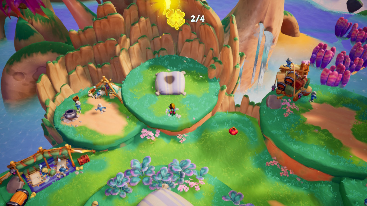 Les Schtroumpfs – L’Épopée des Rêves est un jeu de plateformes en 3 dimensions avec une caméra fixe la plupart du temps (un peu comme dans Super Mario 3D World, et promis on arrête là les comparaisons !). Votre petit Schtroumpf pourra donc se déplacer librement dans les environnements qui de leur côté sont délimités et flottent au-dessus du vide (forcément, vu que ce sont des parcelles de rêves). Le Schtroumpf que l’on dirige a également la capacité de courir pour avancer plus vite en maintenant une touche enfoncée, de sauter, mais aussi de faire une petite course dans les airs pour sauter un peu plus loin (un peu comme…Schtroumpf !). Outre ces capacités « naturelles », monde des rêves oblige, notre vaillant petit Schtroumpf dispose également de capacités spéciales (assez proches de la télékinésie). Ainsi, il peut faire sortir des plateformes des murs ou faire venir à lui des objets assez proches, par la seule force de sa pensée (et une pression sur le bouton R). Une capacité qui lui permettra également de faire exploser des pinatas avec la tête d’Azraël. Mais ce n’est pas tout : il est également possible de générer une bulle autour de notre petit lutin bleu, lui permettant de flotter (de façon statique) dans les airs pendants quelques secondes… (le temps qu’une plateforme réapparaisse par exemple) et enfin, il est possible de saluer les autres Schtroumpfs avec le bouton L pour récupérer quelques baies de fruits (ou débusquer l’un des Schtroumpfs cachés dans le décor).