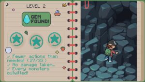 Vous traverserez trois mondes différents avec plus de vingt niveaux chacun, ce qui rend l’aventure de courte durée, avec seulement deux heures nécessaires pour terminer le jeu de base. Pour atteindre les 100%, il faut collecter toutes les gemmes, ne perdre aucun point de vie, effectuer un nombre limité d’actions selon le niveau et éliminer tous les monstres dans chaque niveau. Chaque action, comme frapper, déplacer un caillou ou tuer un ennemi, doit être soigneusement comptabilisée. Si le jeu de base vous plaît, ce défi supplémentaire offre une raison de le rejouer.