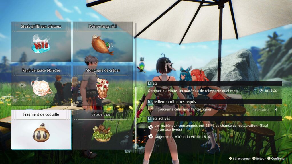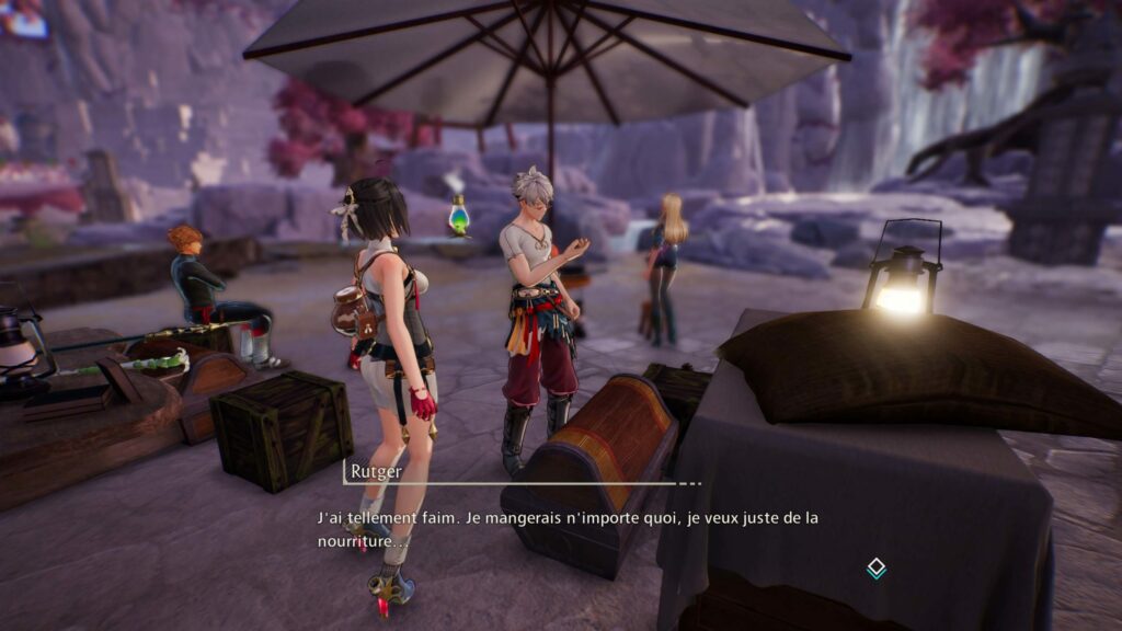 Enfin, si le joueur ne souhaite pas retourner à sa base lors de l’exploration, il pourra établir un campement où il pourra passer du temps à cuisiner, ce qui lui apportera divers avantages lors de l’exploration et du combat, ou se reposer. Se produiront parfois certains événements pour les personnages qui sont exclusifs aux camps, permettant aux joueurs d’en savoir plus sur Yumia et ses compagnons.