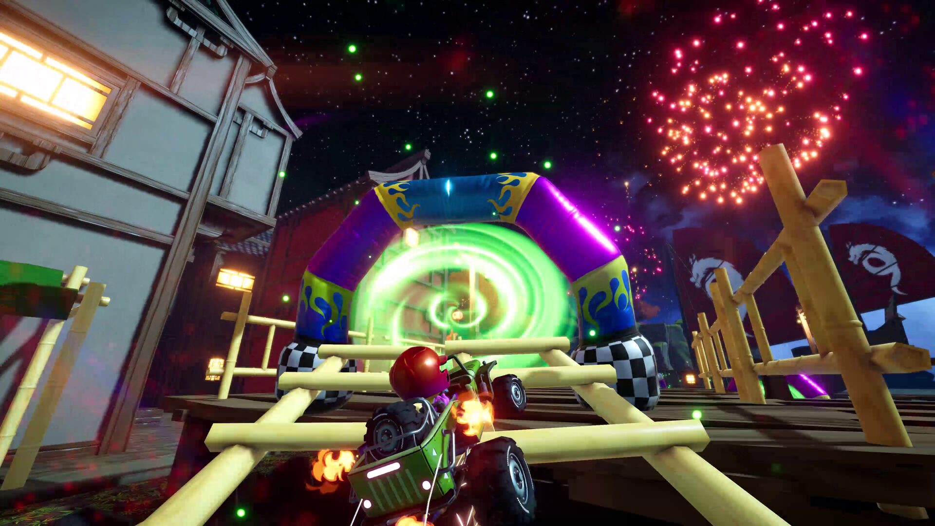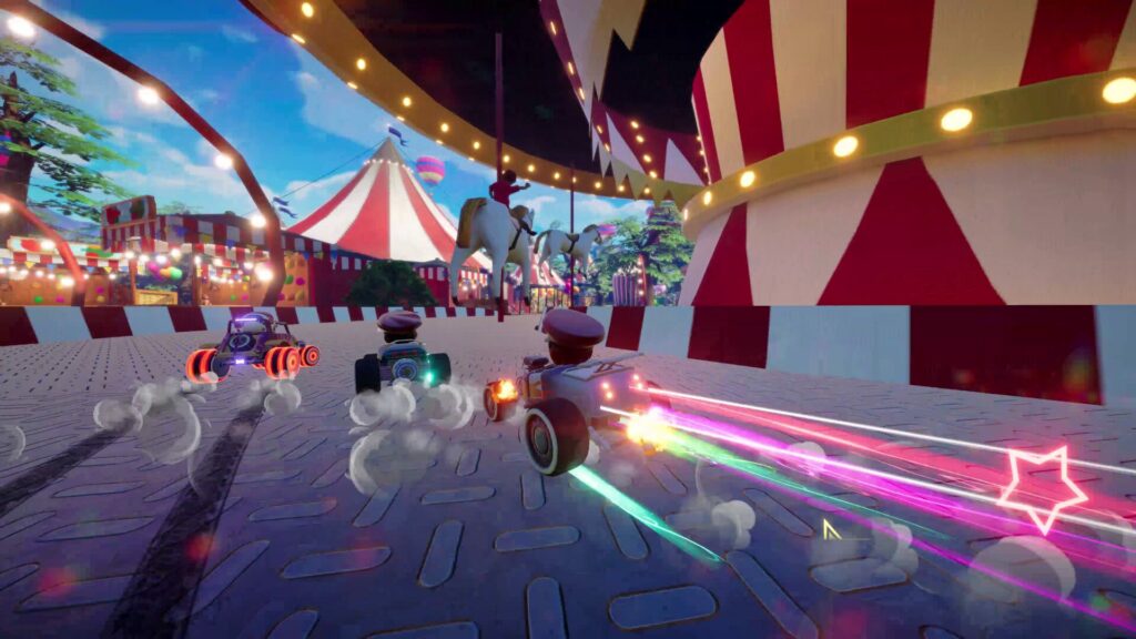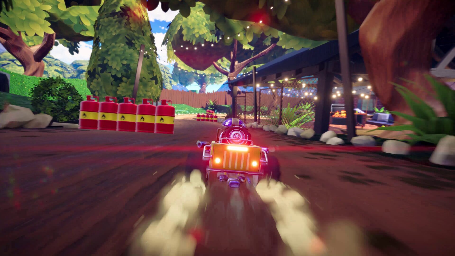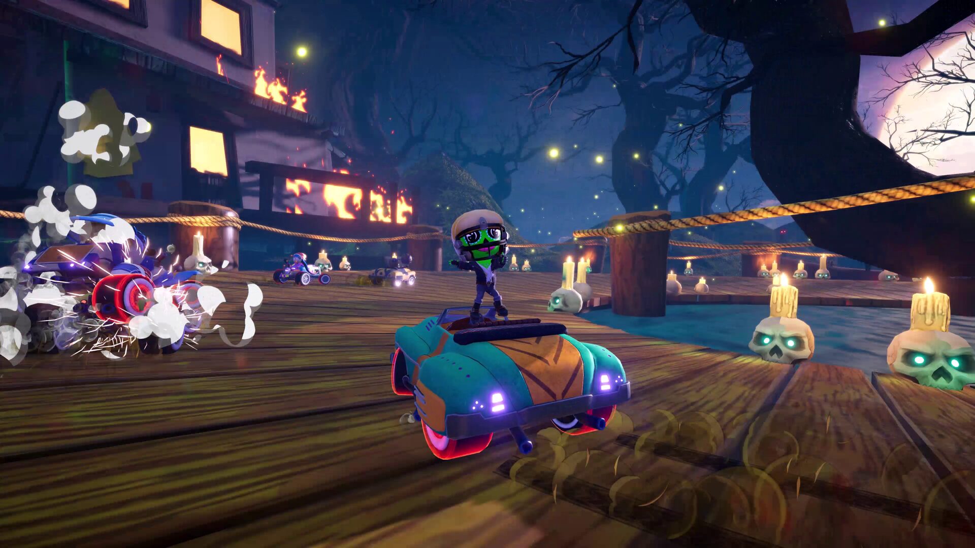 • Courez à travers des pistes épiques ! Ressentez le froid sur Snow Summit, foncez à travers Cyber City, ou célébrez sur Mariachi Mile ! Chaque piste propose des modes avant, miroir, inversé et tordu pour encore plus de chaos !